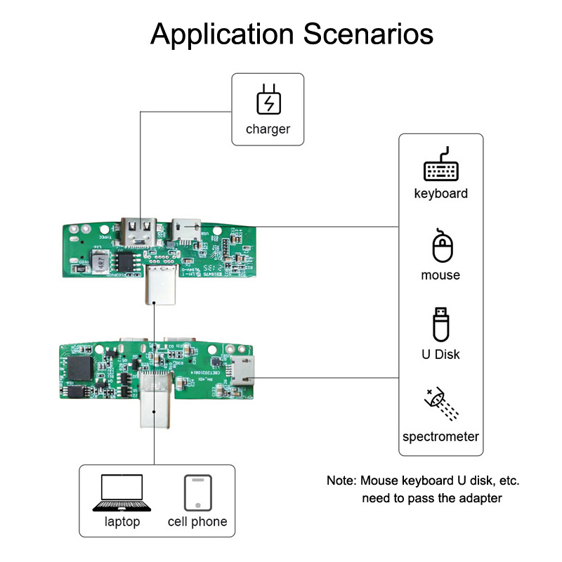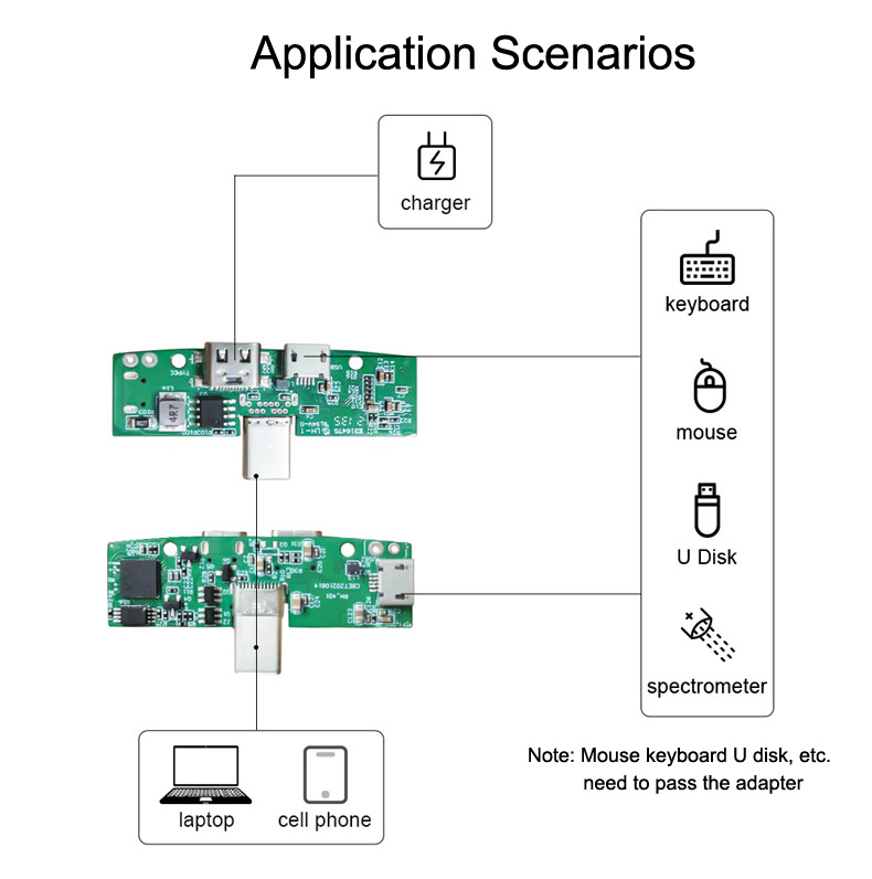 这是一款USB-C HUB扩展坞定制模块,具备以下特点:接口配置输入1个USB Type-C公头,输出/扩展:USB Type-C母头、Micro USB接口,应用场景可连接笔记本电脑、手机等设备,通过充电器供电后,扩展连接键盘、鼠标、U 盘、光谱仪等外设(需适配器适配),实现设备的接口扩展与数据交互,适用于需要多设备连接的办公、科研等场景。