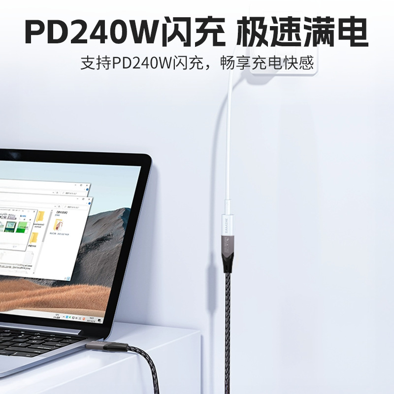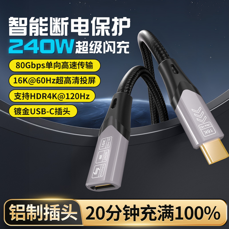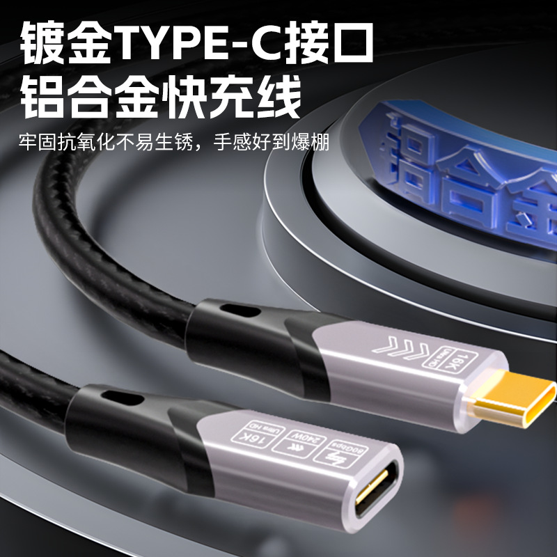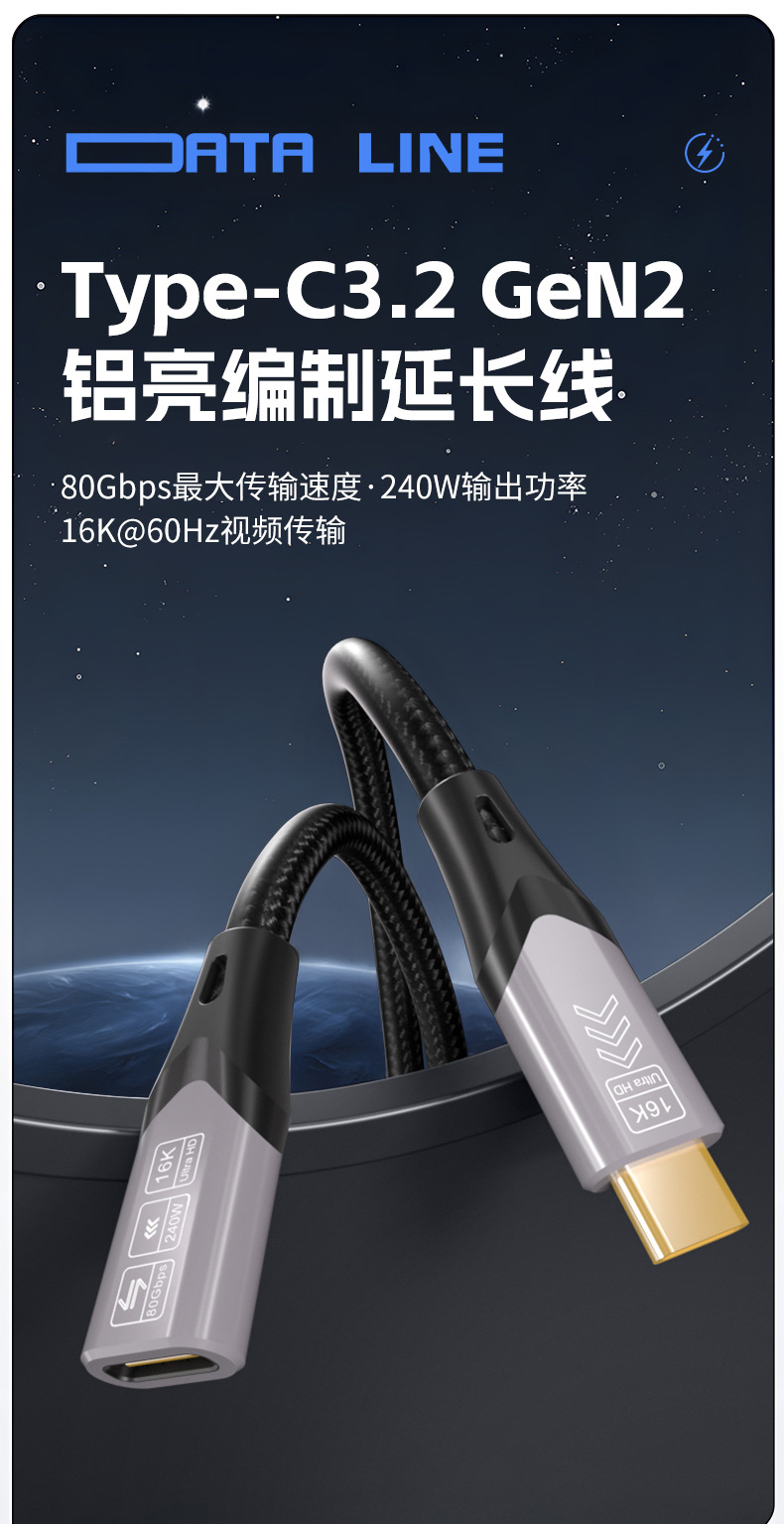 Type-C3.2 GeN2铝亮编制延长线,80Gbps最大传输速度,240W输出功率,16K@60Hz视频传输