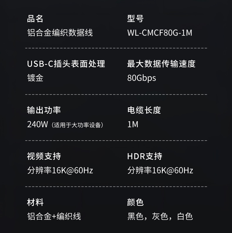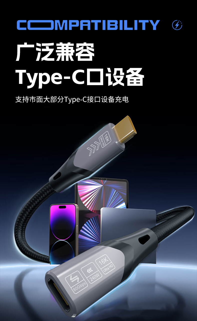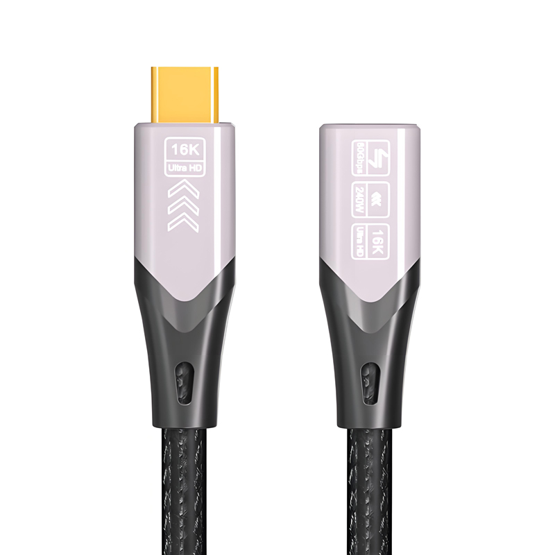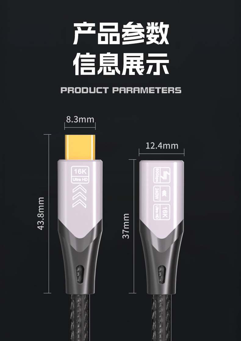 Type-C3.2 GeN2铝亮编制延长线,80Gbps最大传输速度,240W输出功率,16K@60Hz视频传输