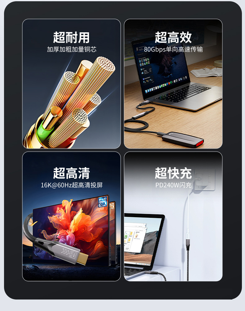 雷电5数据线 全功能type-c视频线16K高清PD240W快充硅胶线