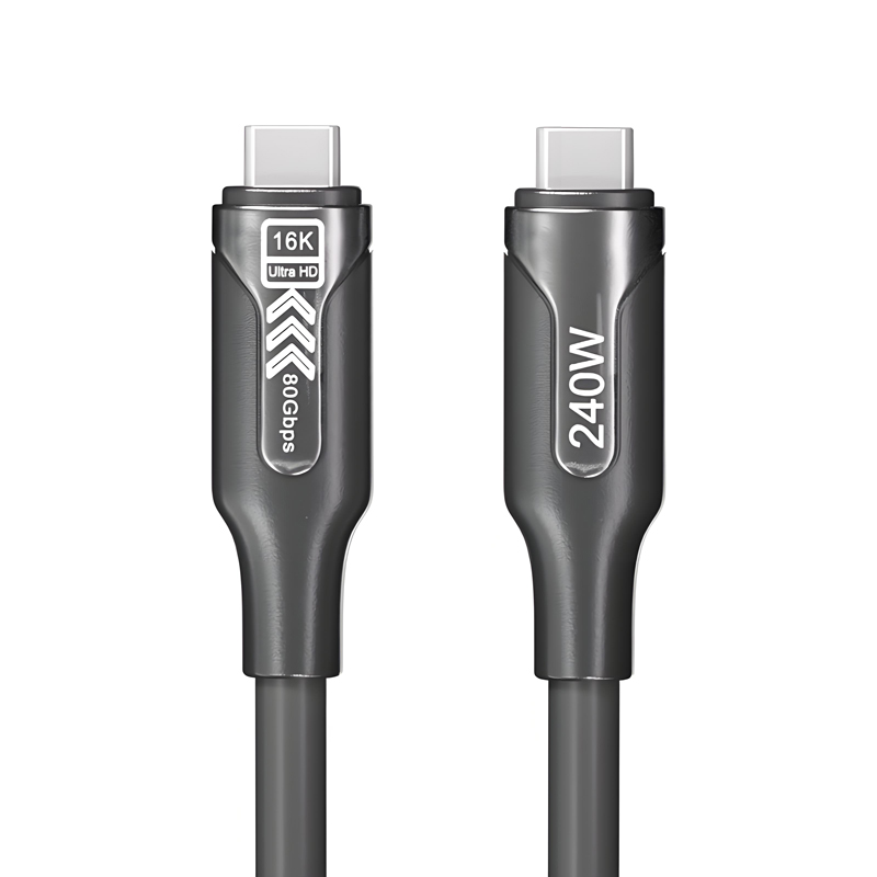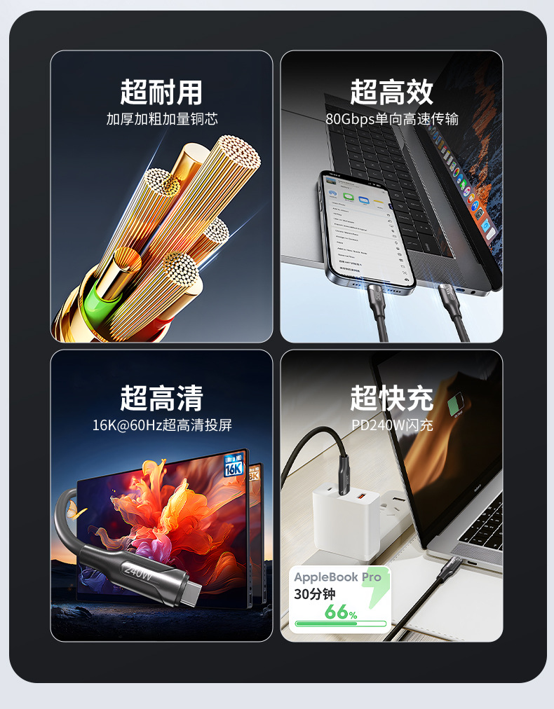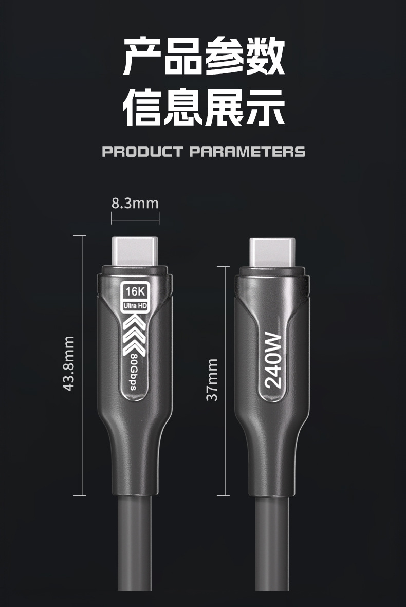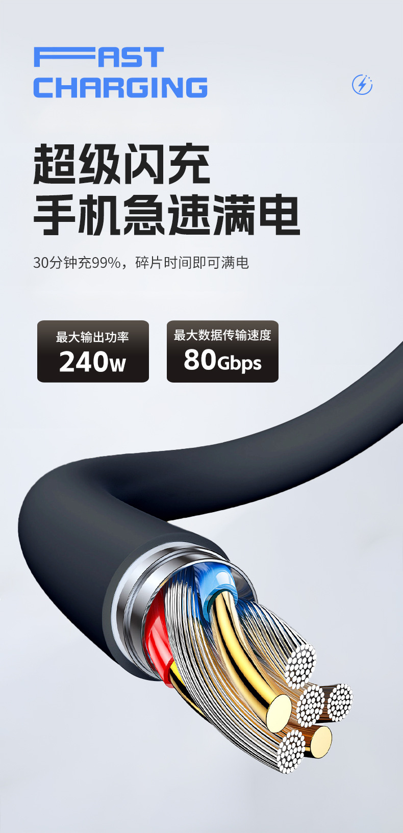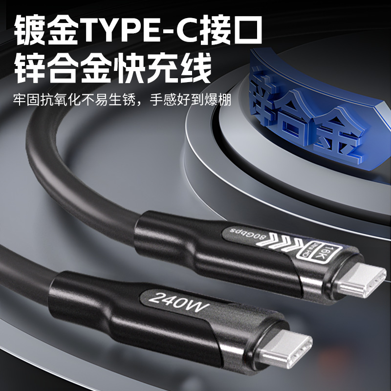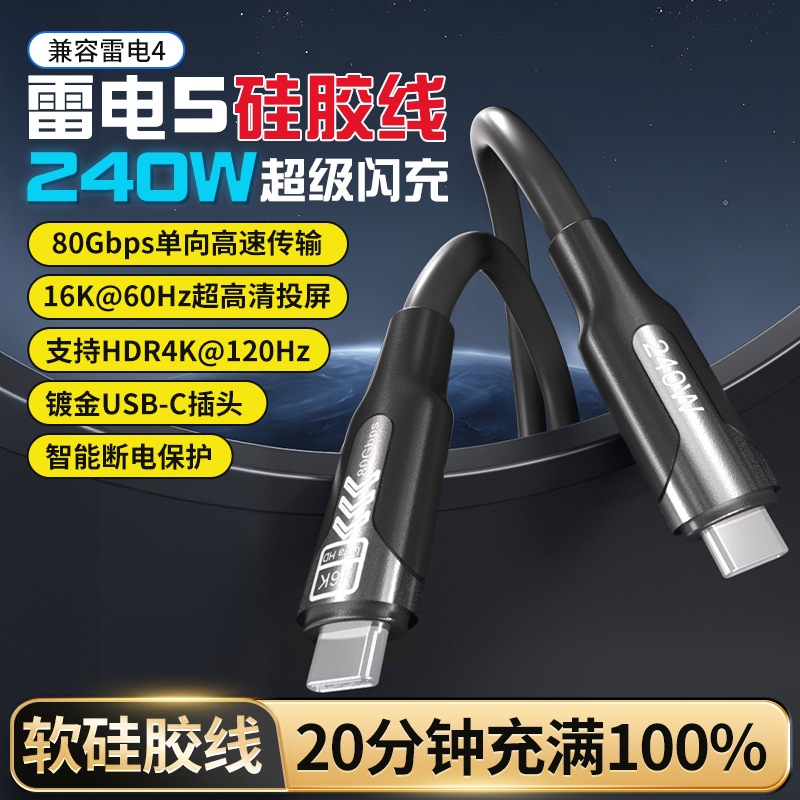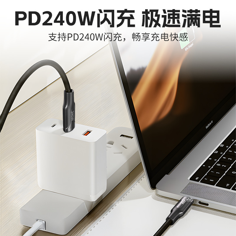 全功能type-c快充硅胶线,支持80Gbps最大传输速度、240W输出功率和16K@60Hz视频传输