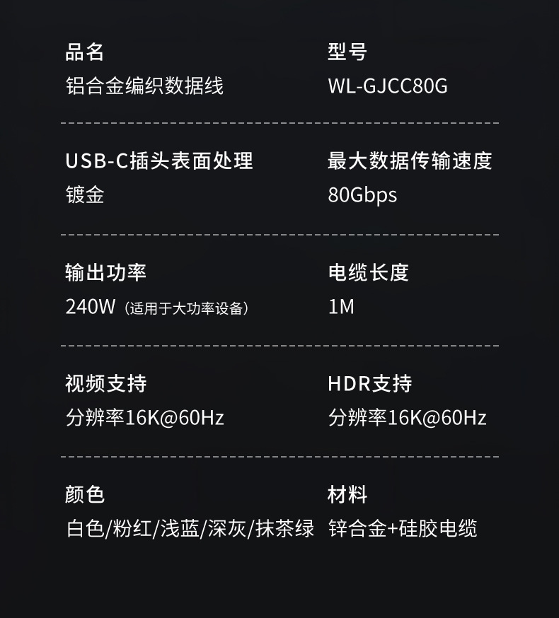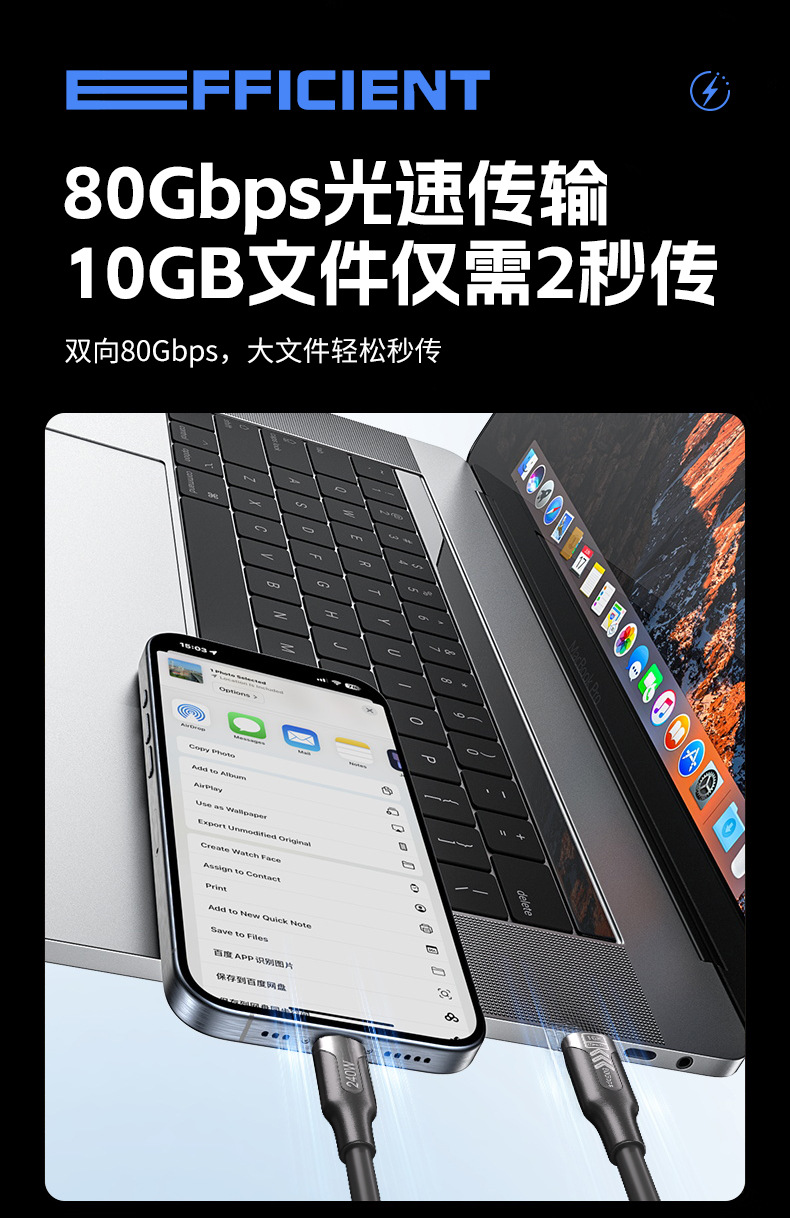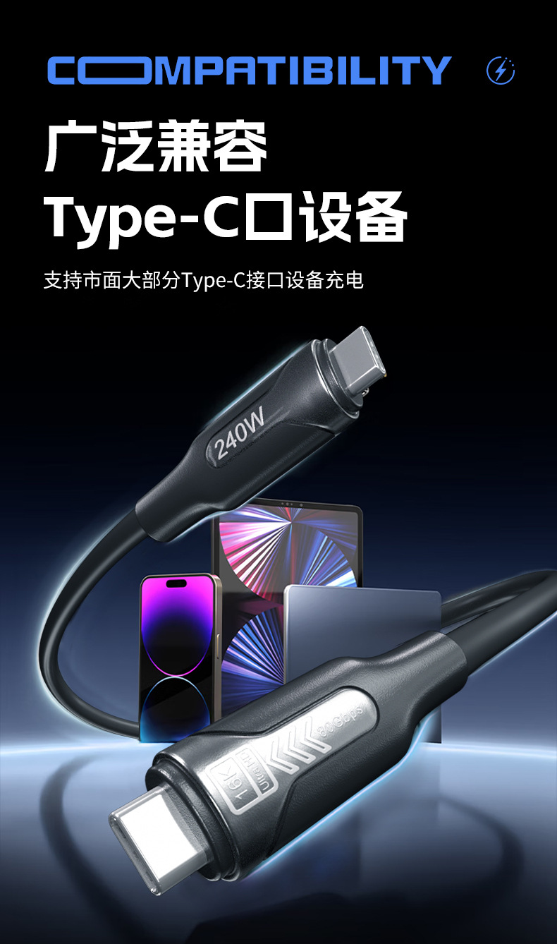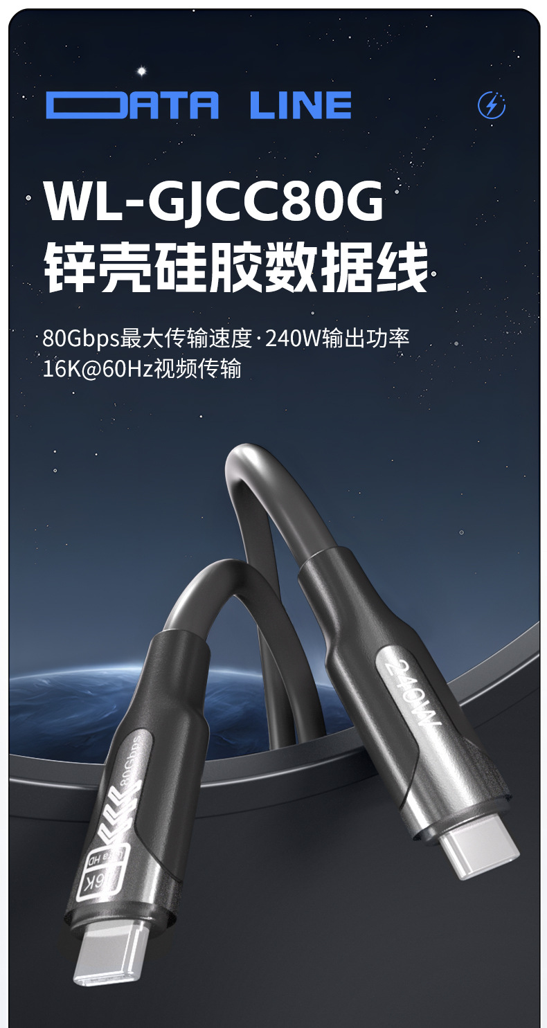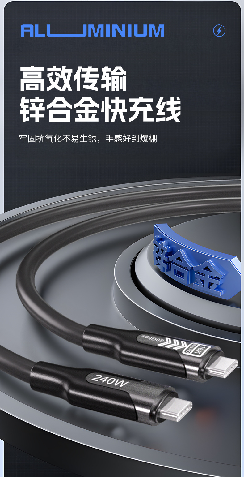 全功能type-c快充硅胶线,支持80Gbps最大传输速度、240W输出功率和16K@60Hz视频传输
