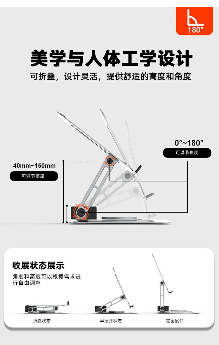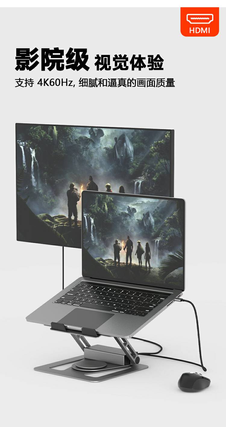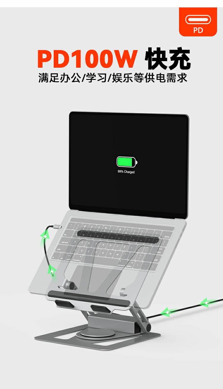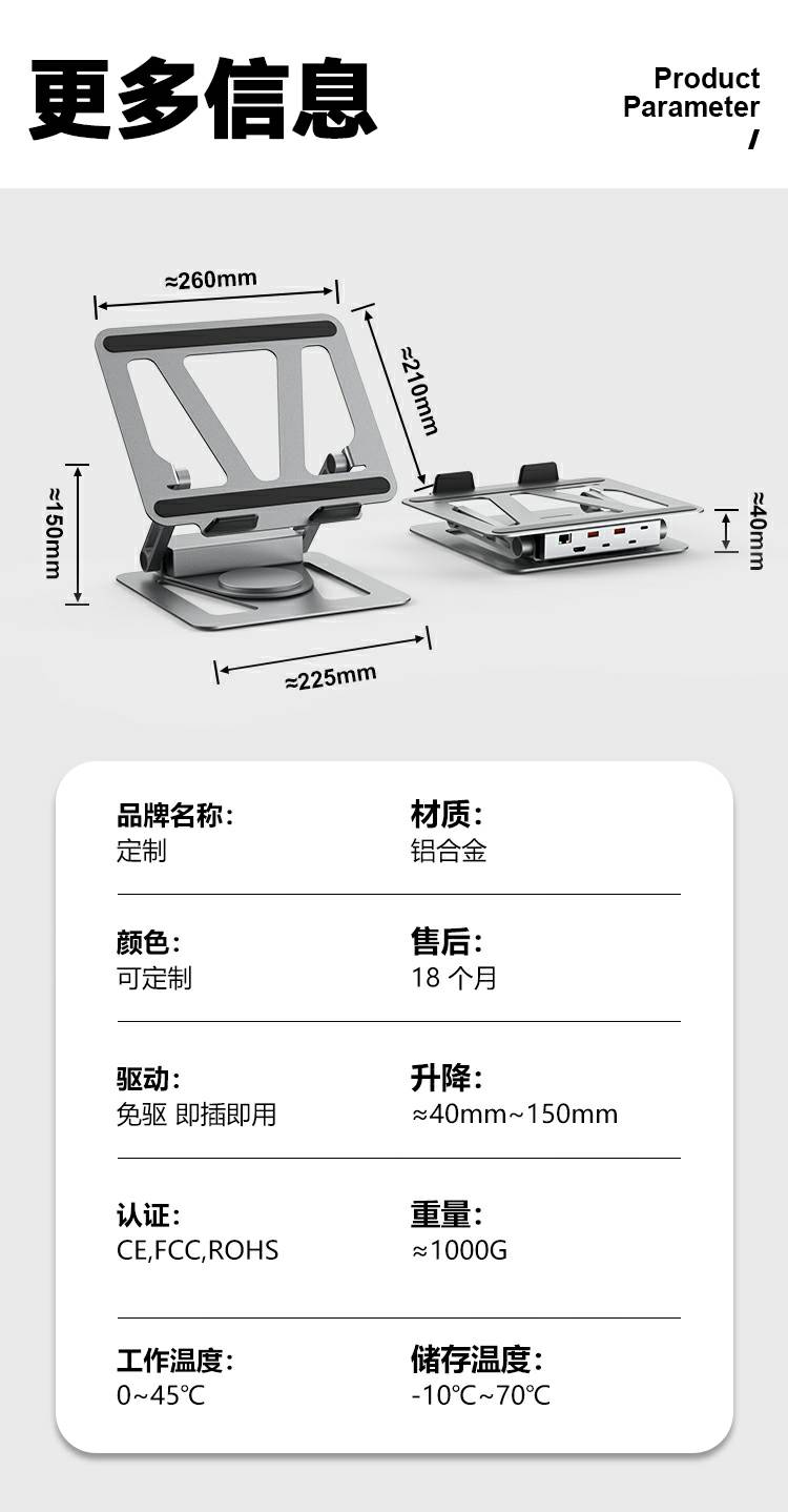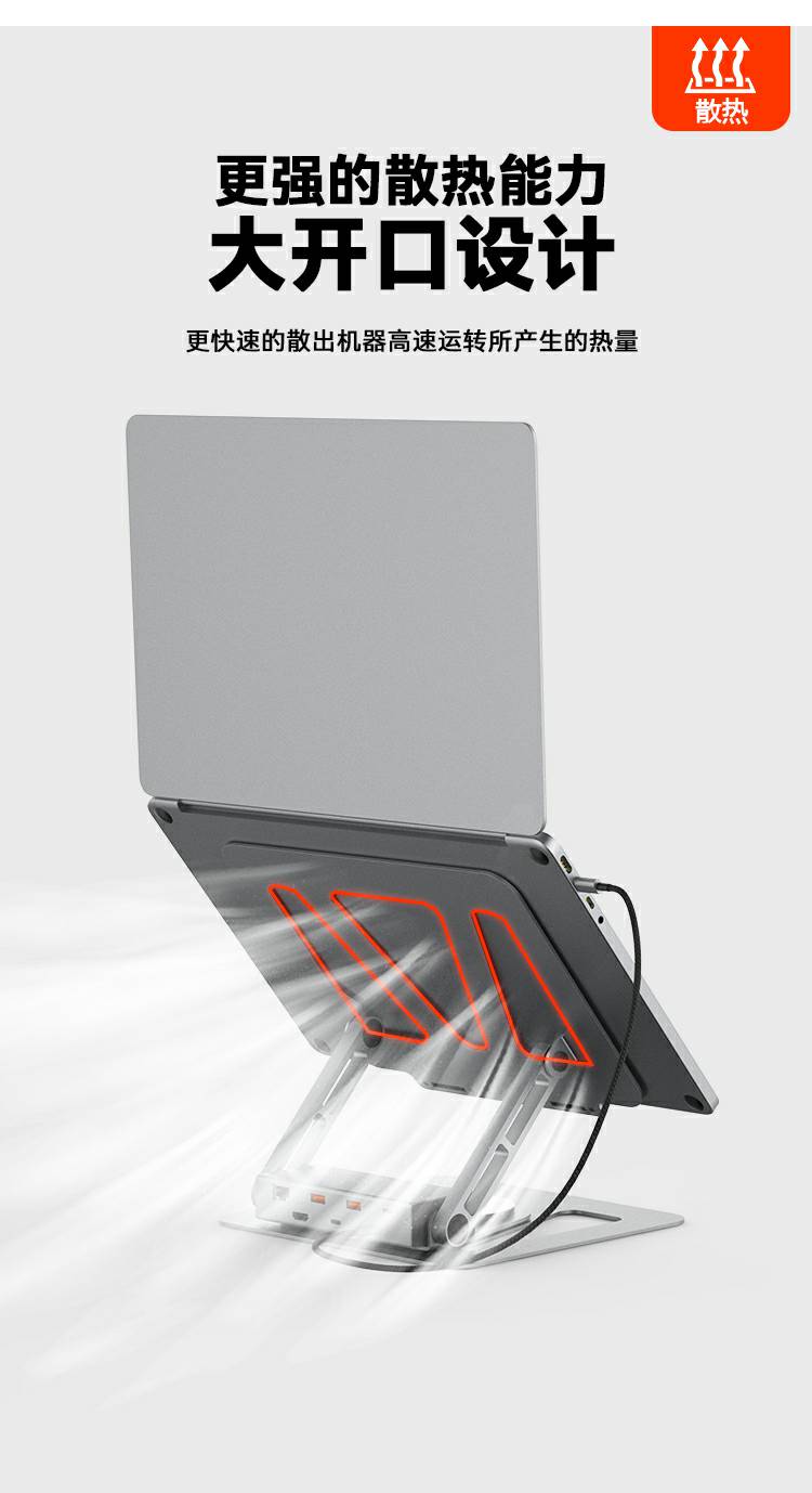 高效散热,可替换/拆卸;美学与人体工学设计,角度和高度可自由调整;支持重量高达22磅,适合10-17英寸的笔记本电脑;扩展坞支持端口定制。