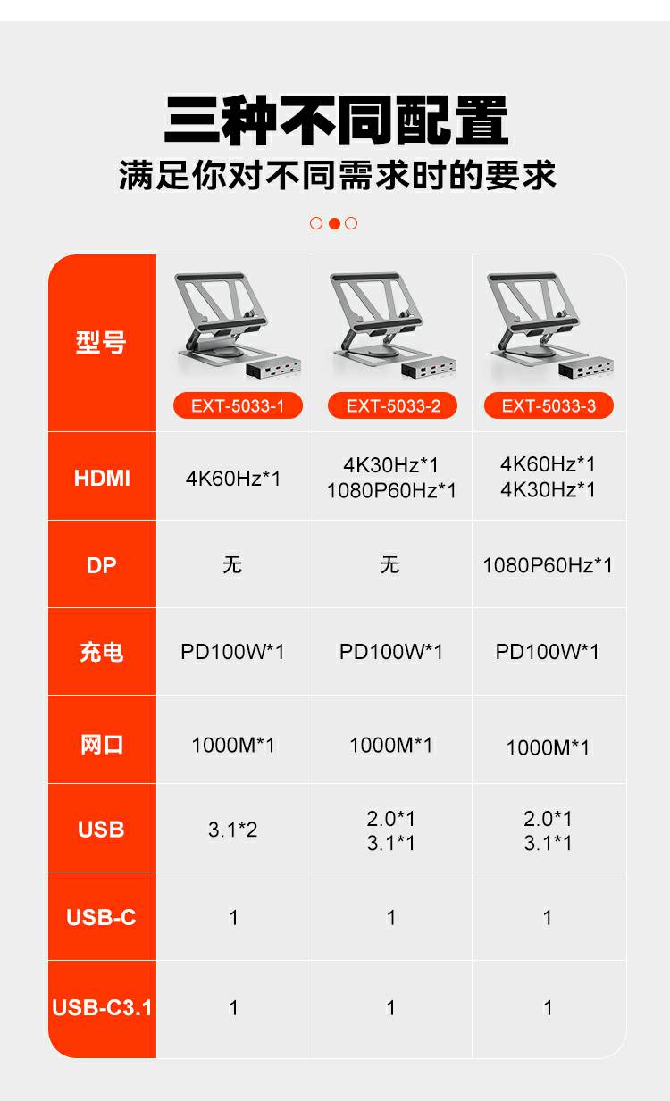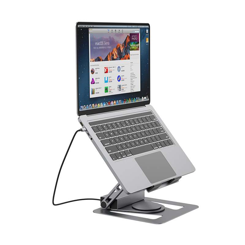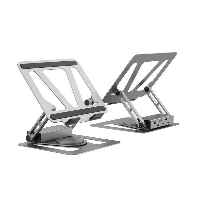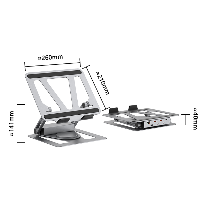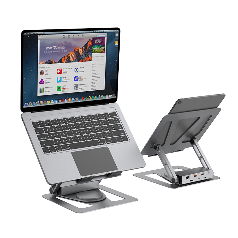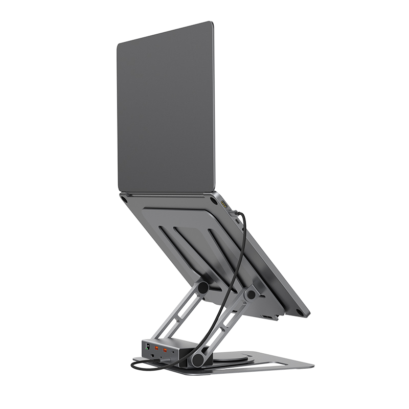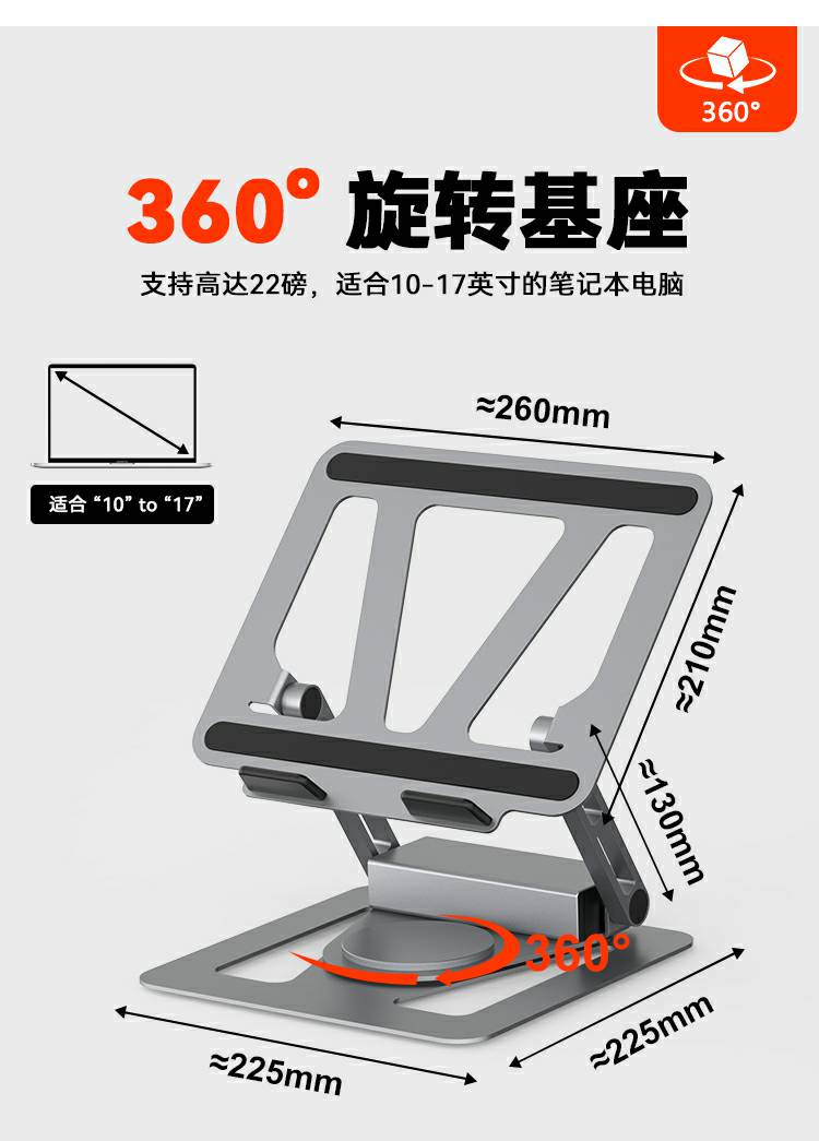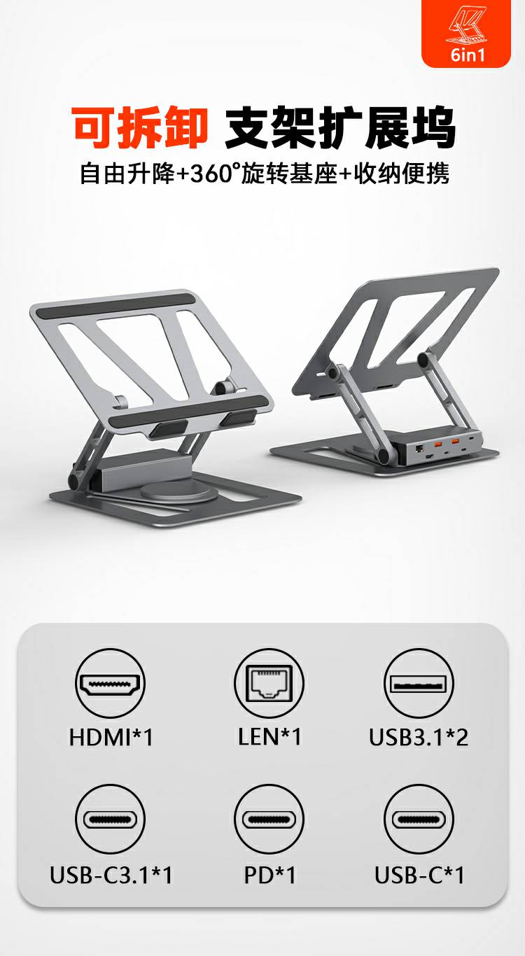 高效散热,可替换/拆卸;美学与人体工学设计,角度和高度可自由调整;支持重量高达22磅,适合10-17英寸的笔记本电脑;扩展坞支持端口定制。