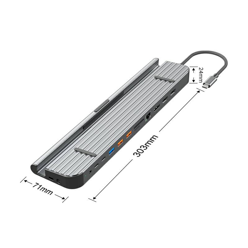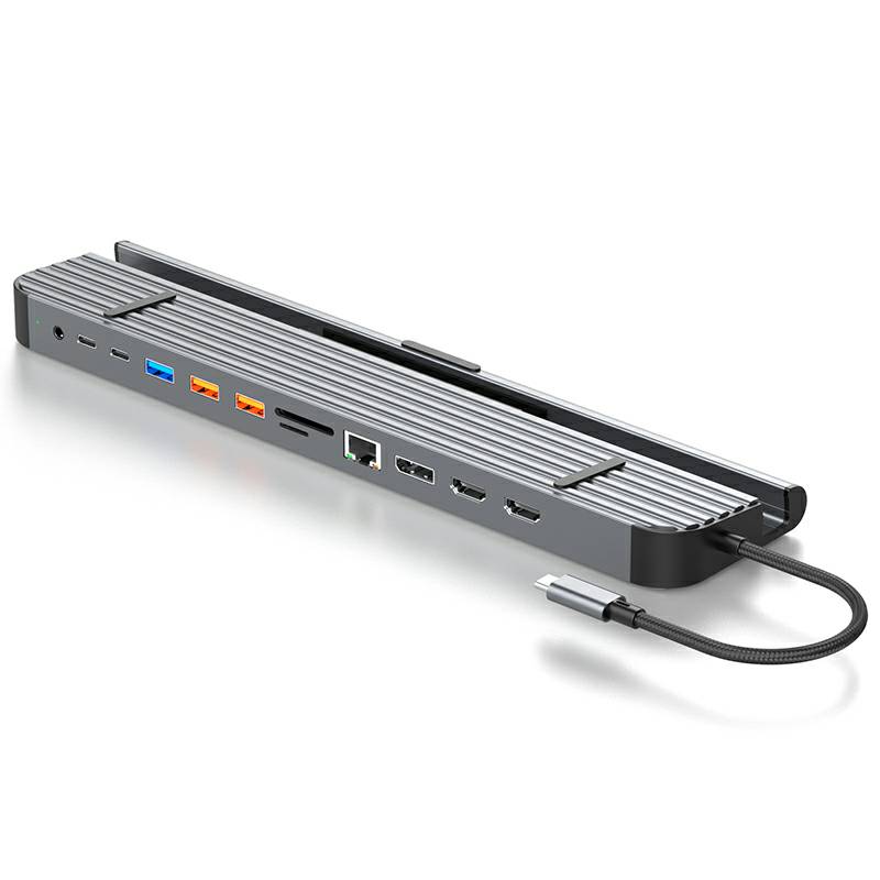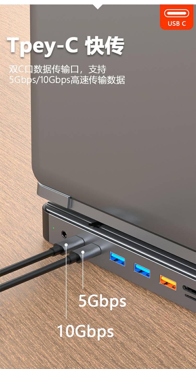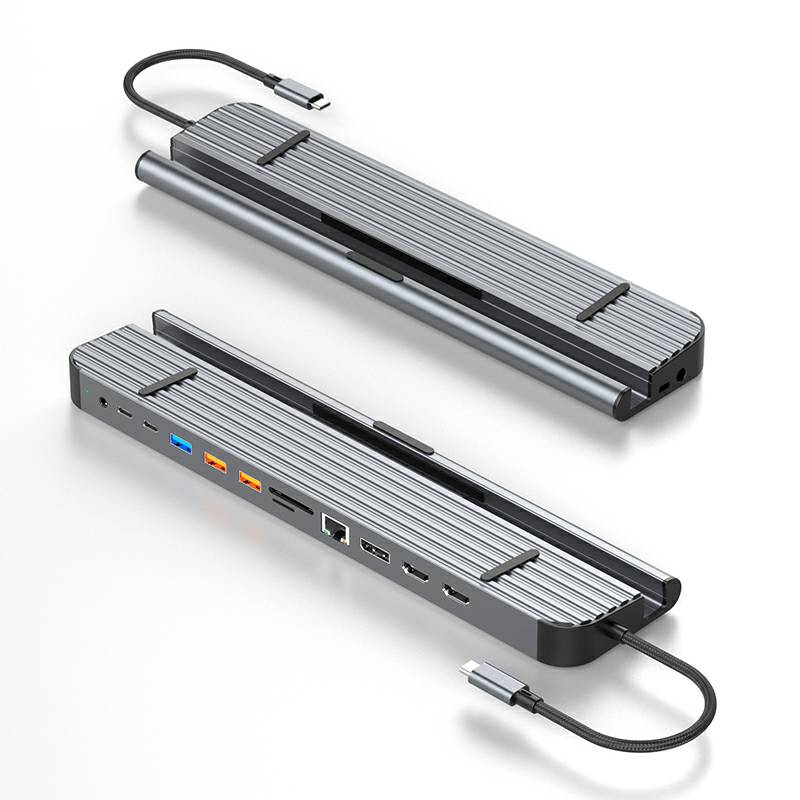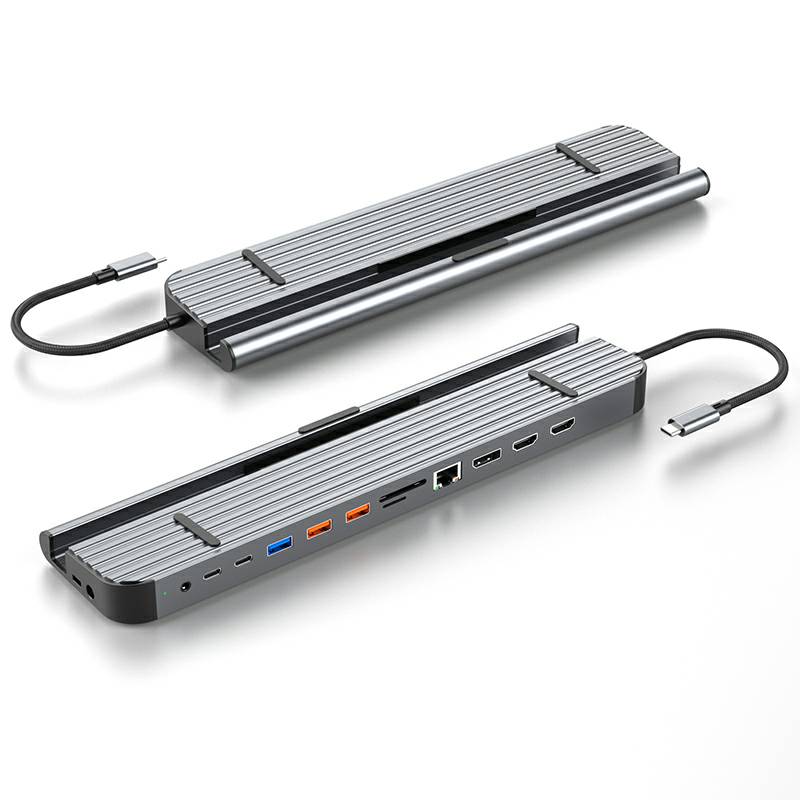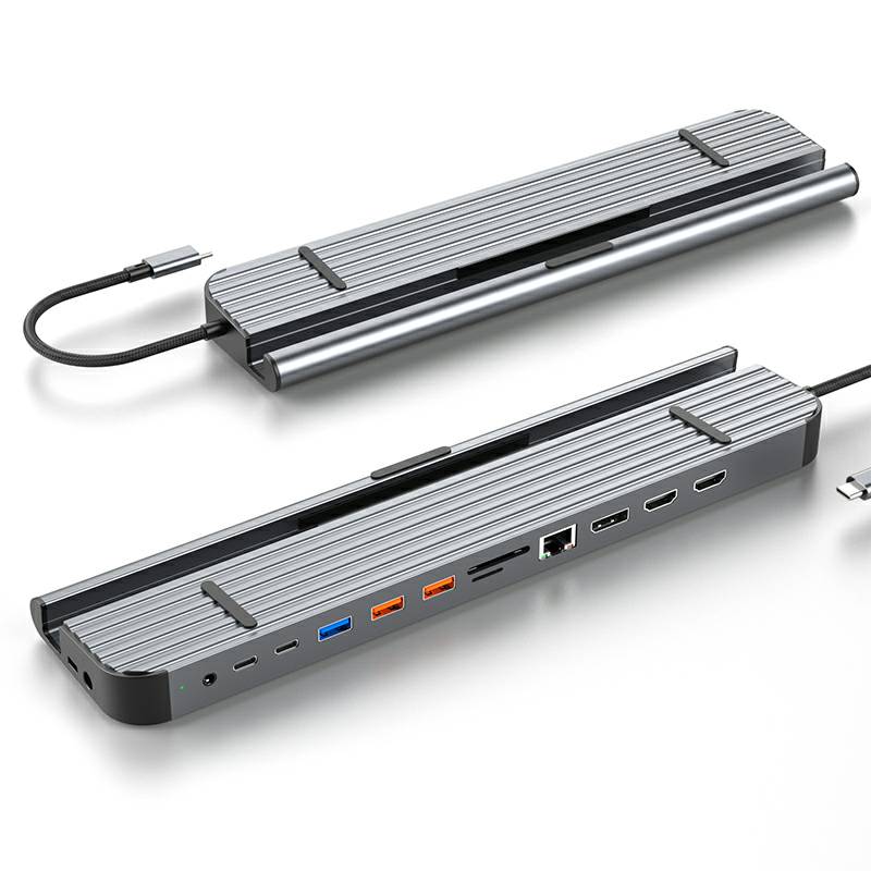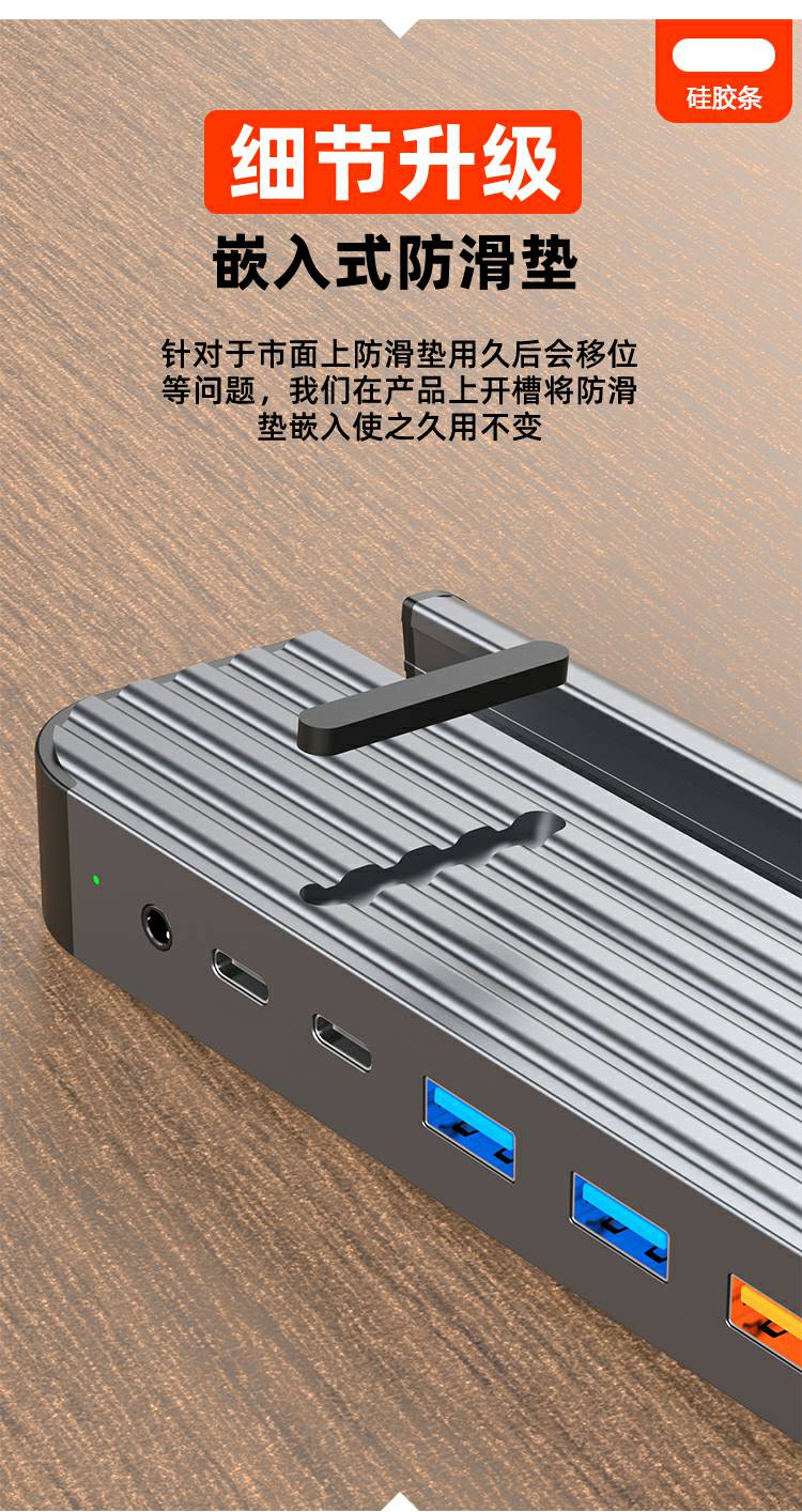 13合1铝合金长条支架Type-C扩展坞,支持5/10Gbps高速传输;自带千兆网口,网络连接更加稳定;在保证良好的散热性的前提下也能满足各种端口的需求。