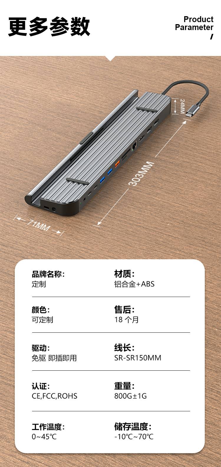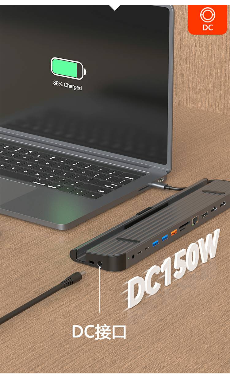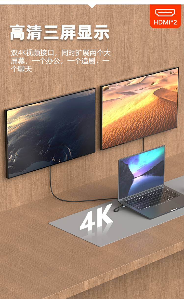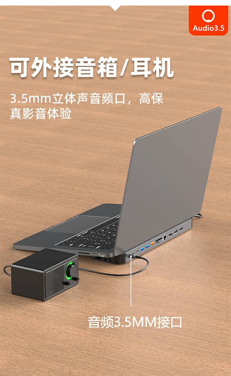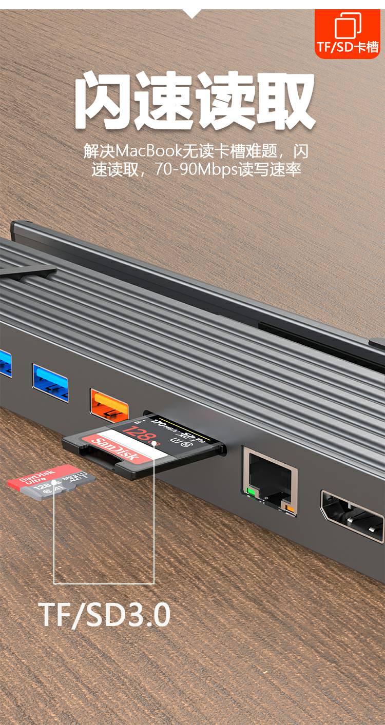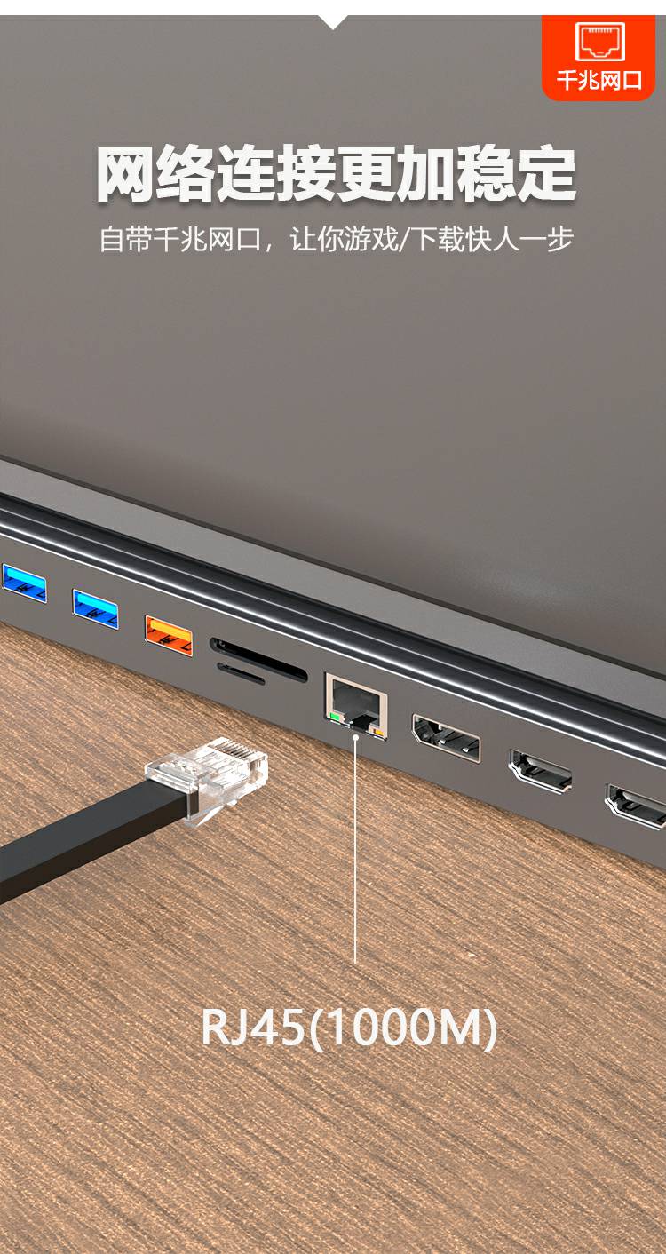 13合1铝合金长条支架Type-C扩展坞,支持5/10Gbps高速传输;自带千兆网口,网络连接更加稳定;在保证良好的散热性的前提下也能满足各种端口的需求。