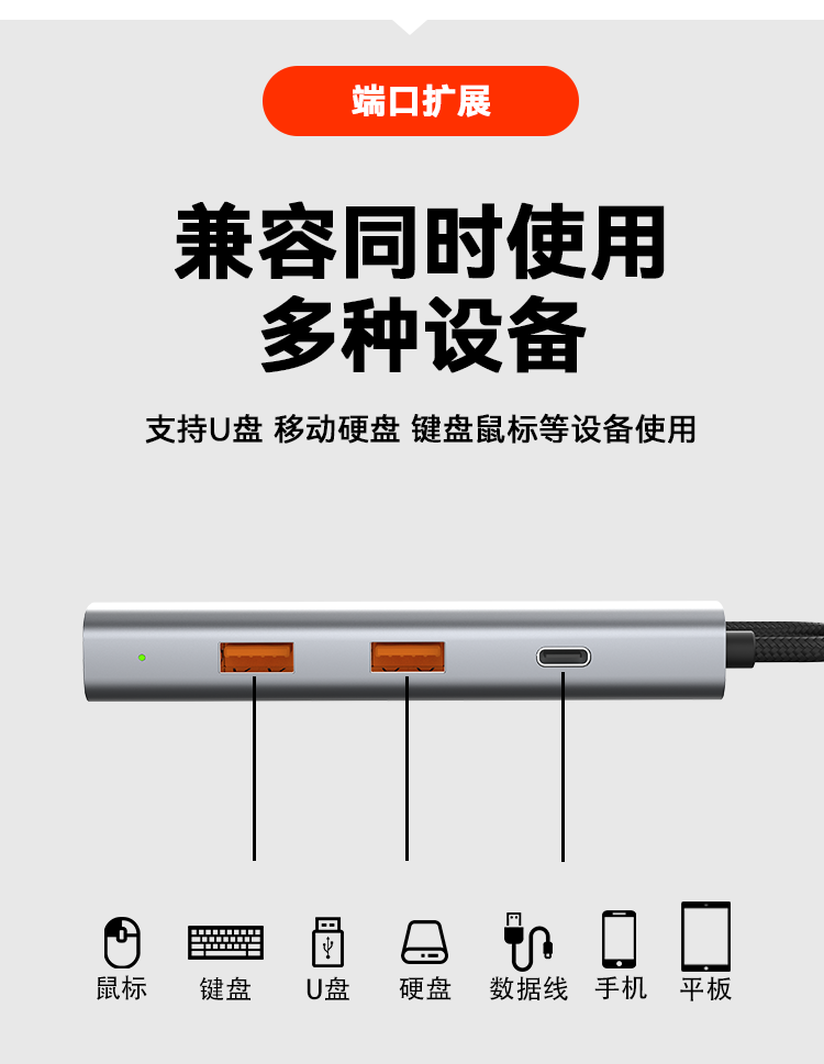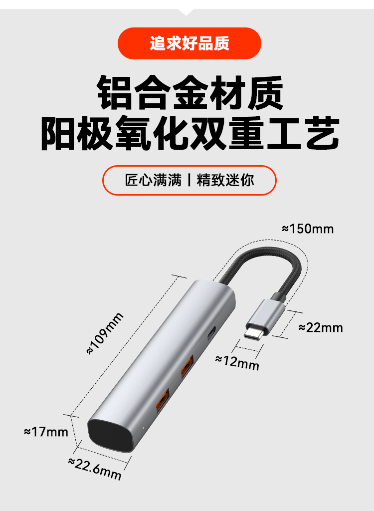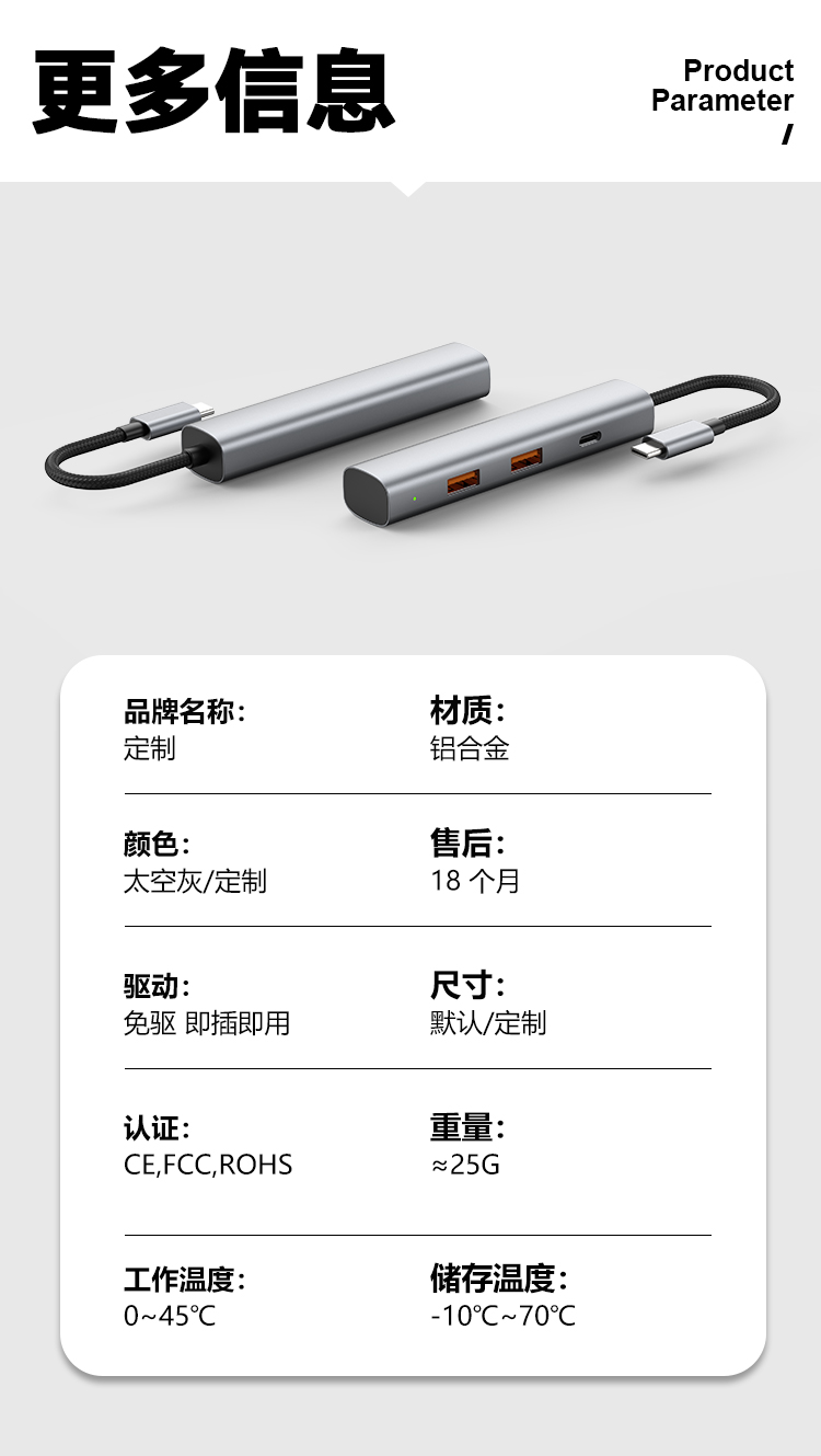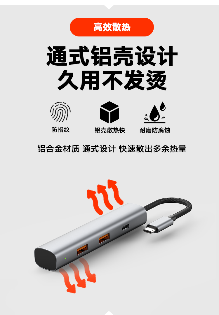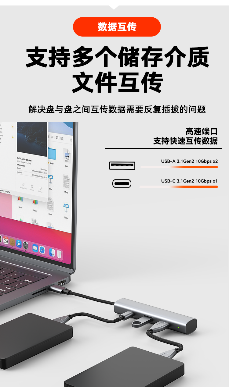 采用铝合金材质阳极氧化双重工艺;10Gbps高速传输,支持多个储存介质文件互传数据;高效散热,久用不发烫;兼容同时使用多种设备。
