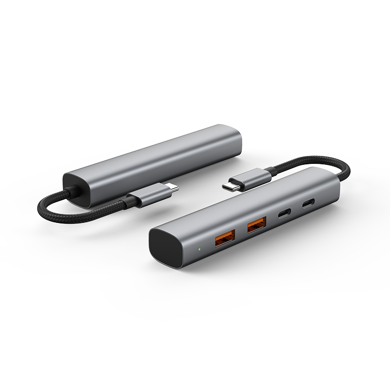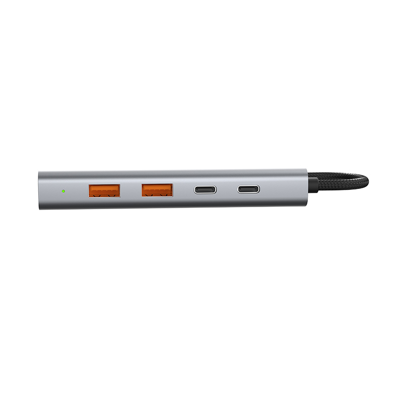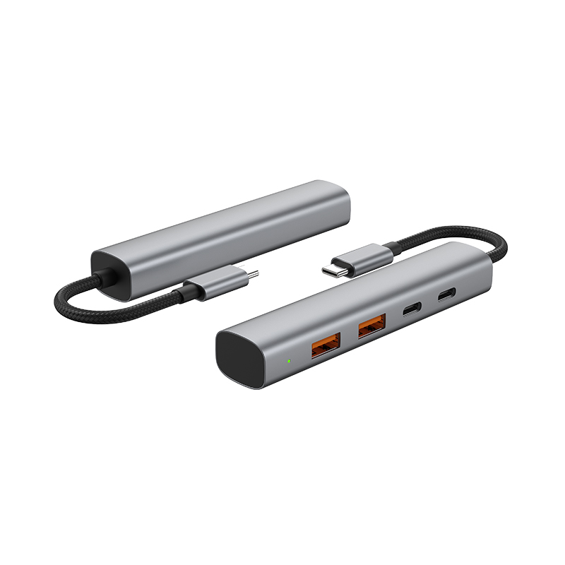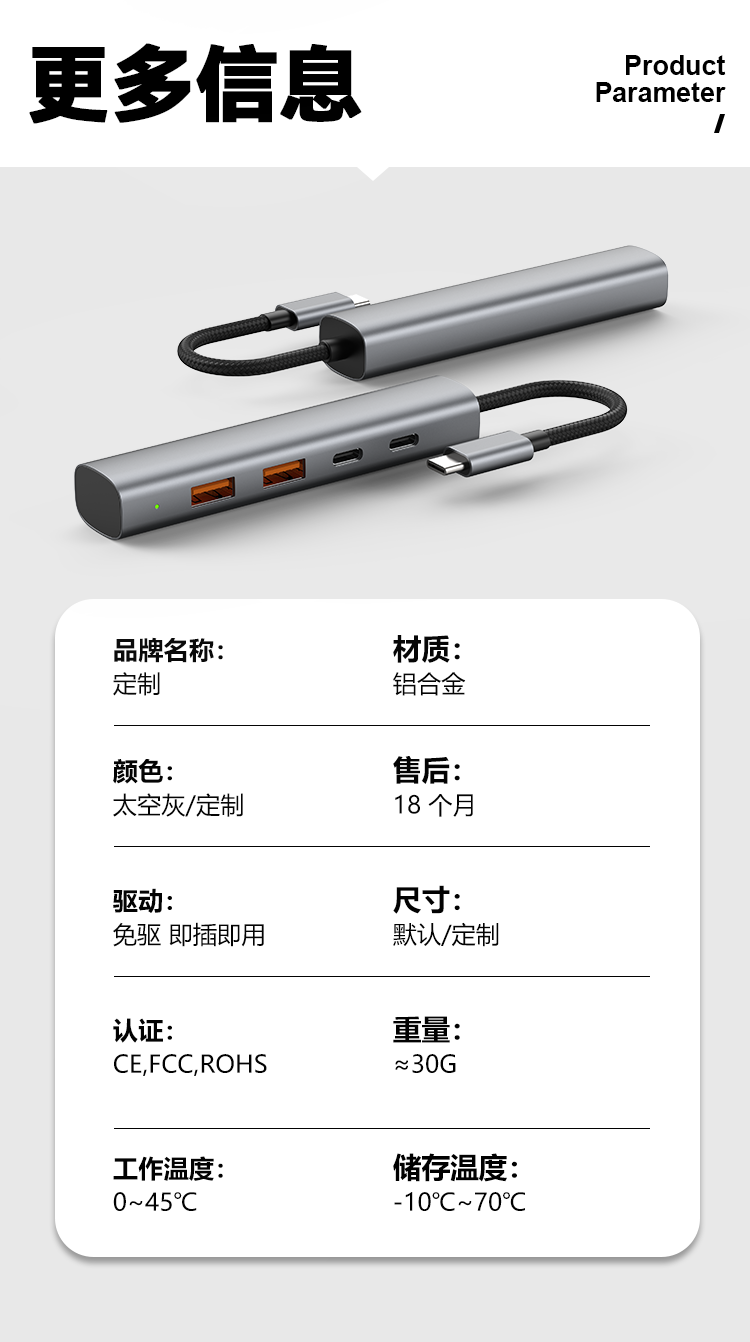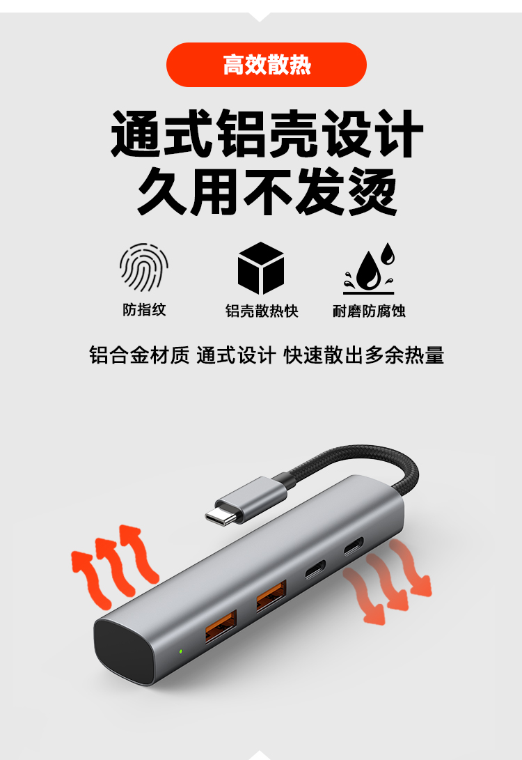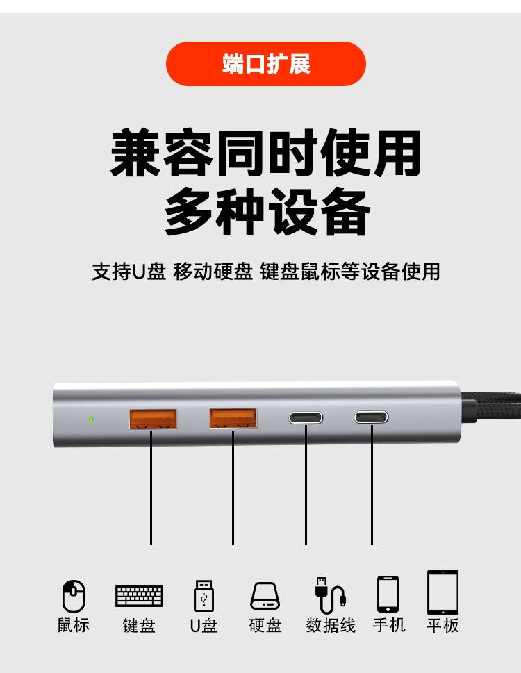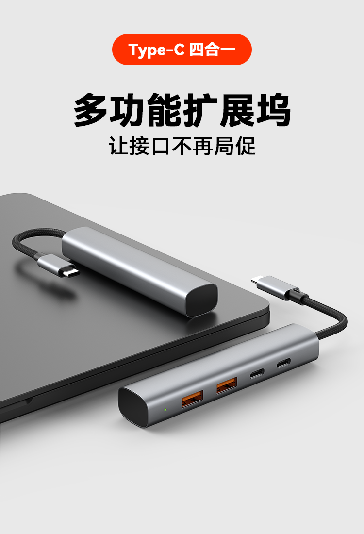 铝合金Type-C四合一编织线长条扩展坞,10Gbps高速传输,支持多个储存介质文件互传数据;高效散热,通式铝壳设计,久用不发烫;兼容同时使用多种设备。
