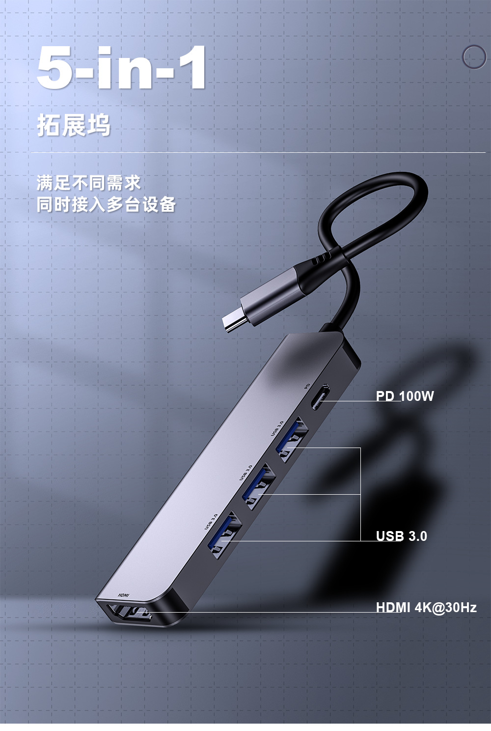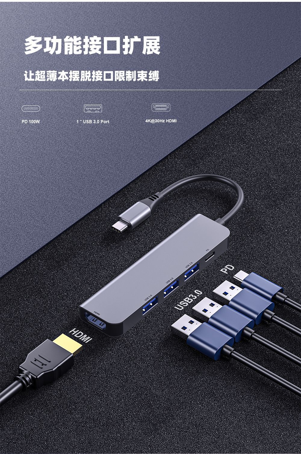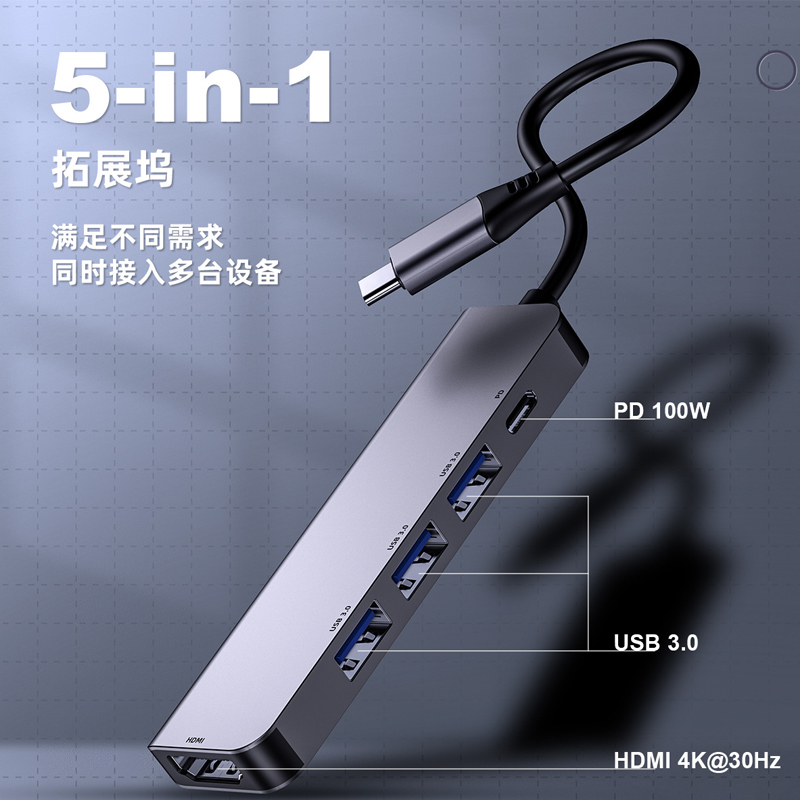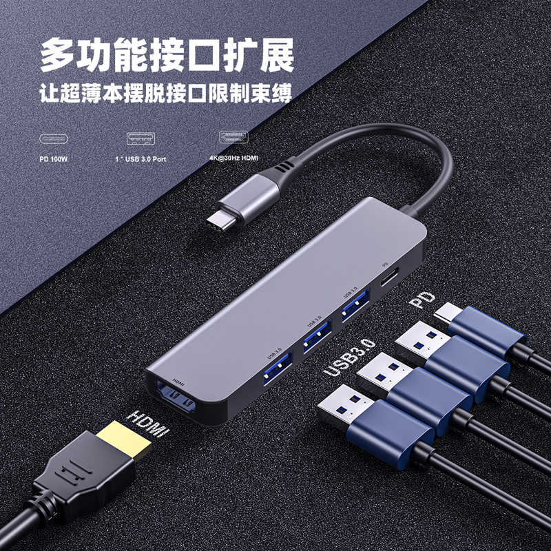 5合1 USB HUB拓展坞满足不同需求同时接入多台设备,让超薄本摆脱接口限制束缚,Type-C转HDMI高清4K30Hz+3*USB3.0+PD,供电更足,支持定制!