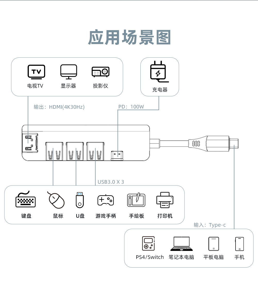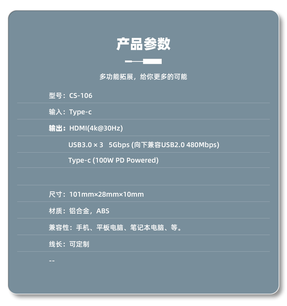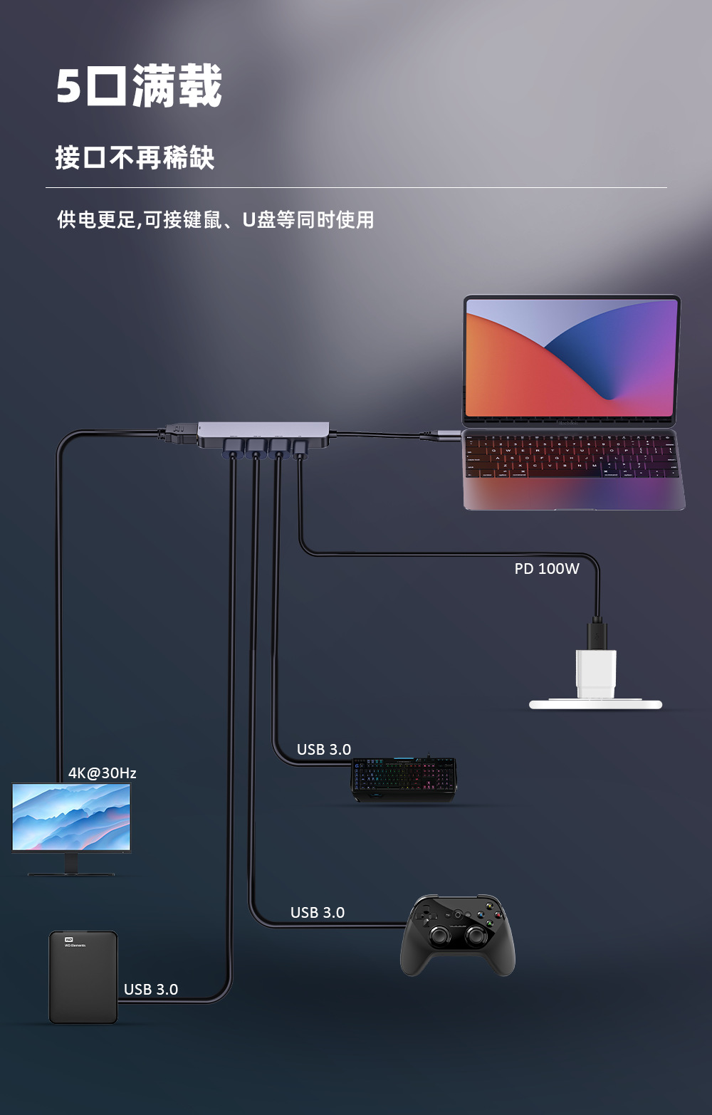 5合1 USB HUB拓展坞满足不同需求同时接入多台设备,让超薄本摆脱接口限制束缚,Type-C转HDMI高清4K30Hz+3*USB3.0+PD,供电更足,支持定制!