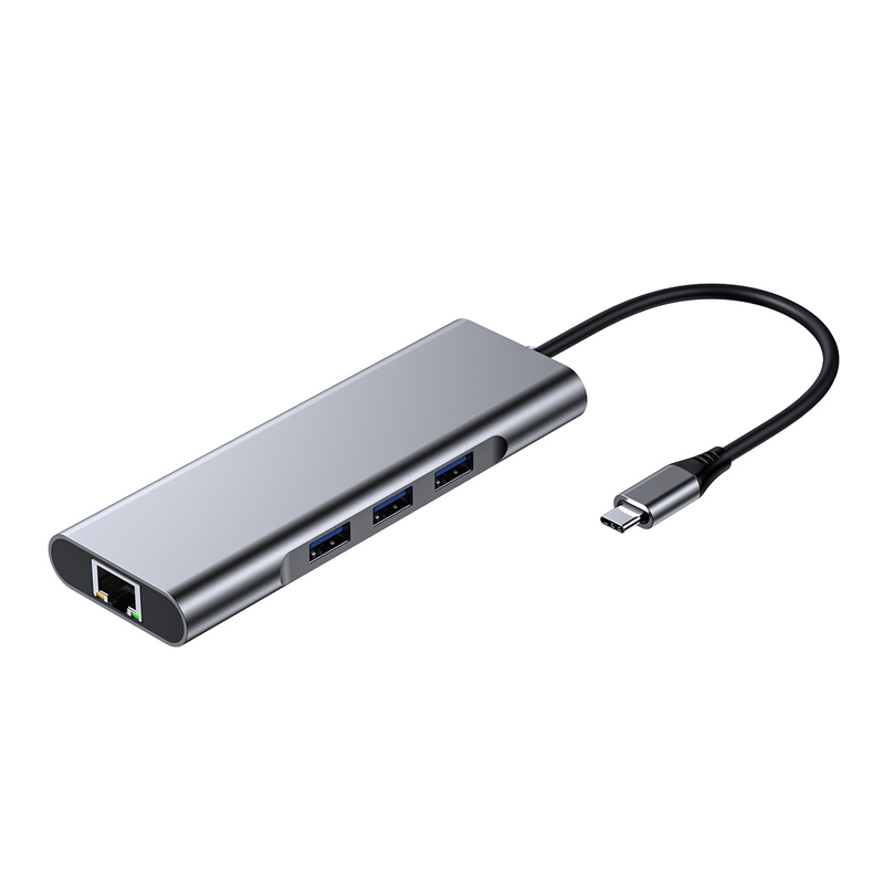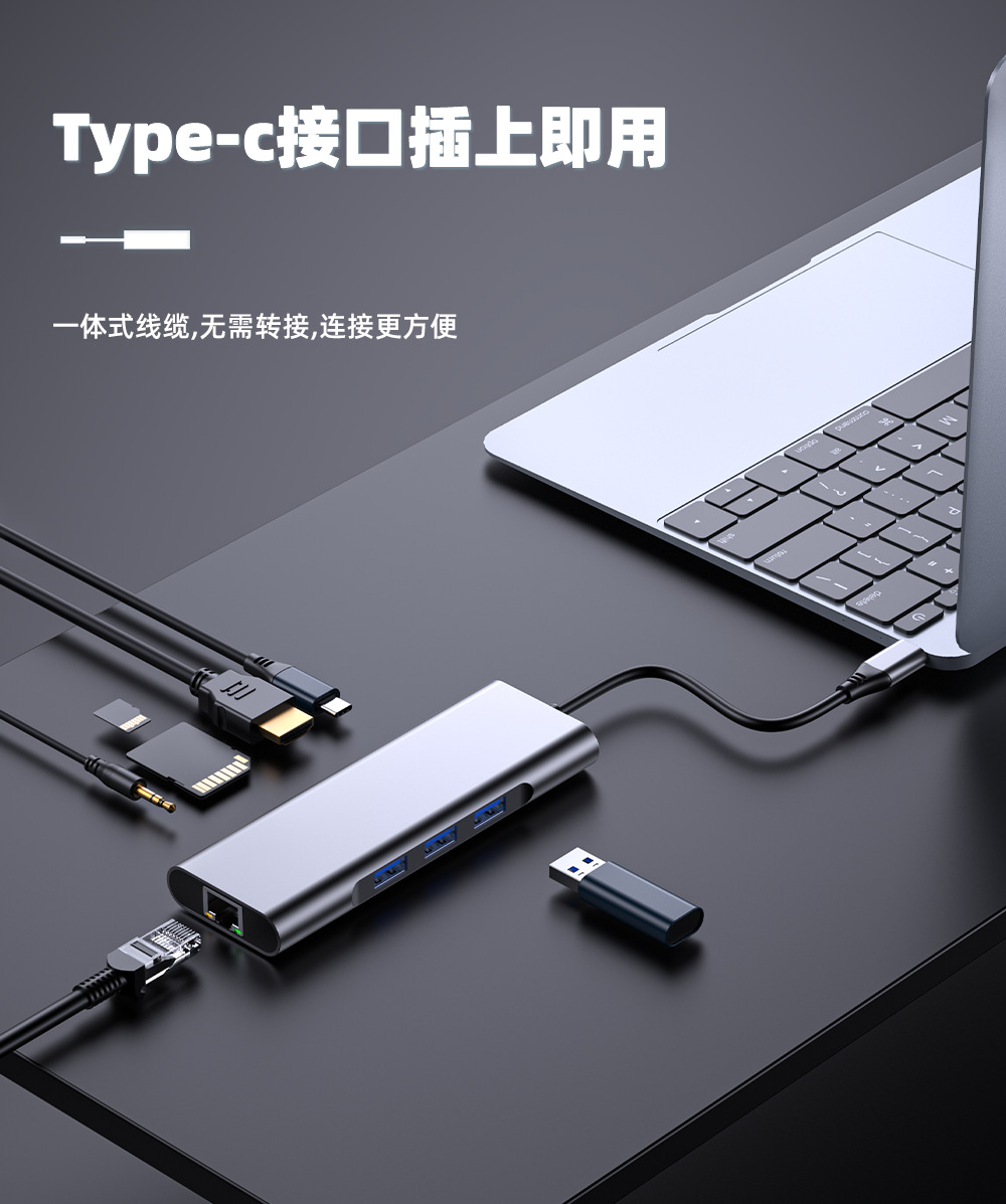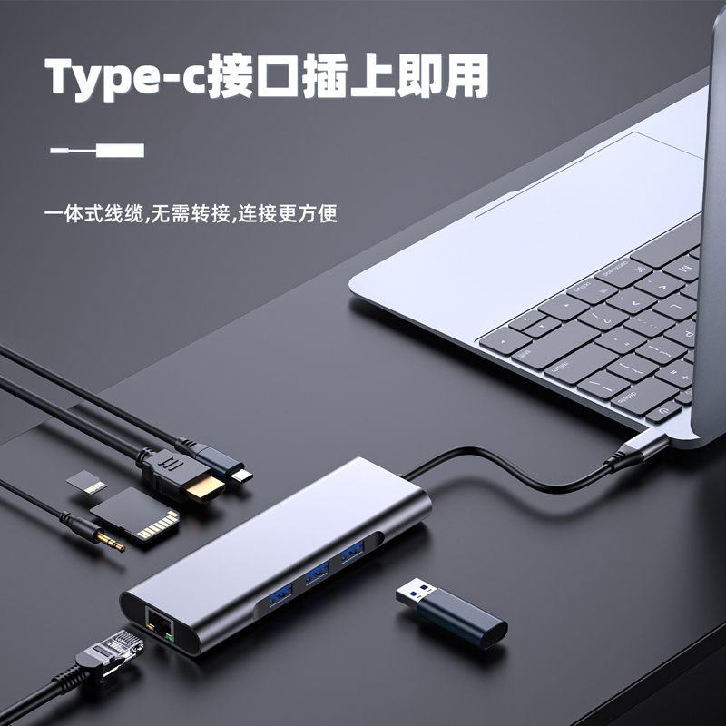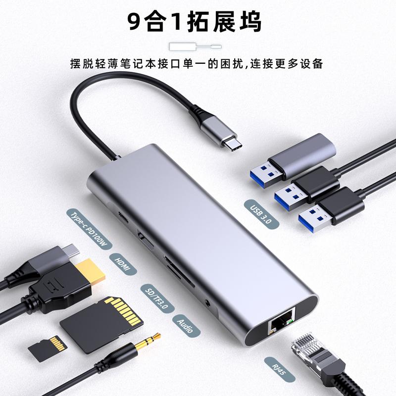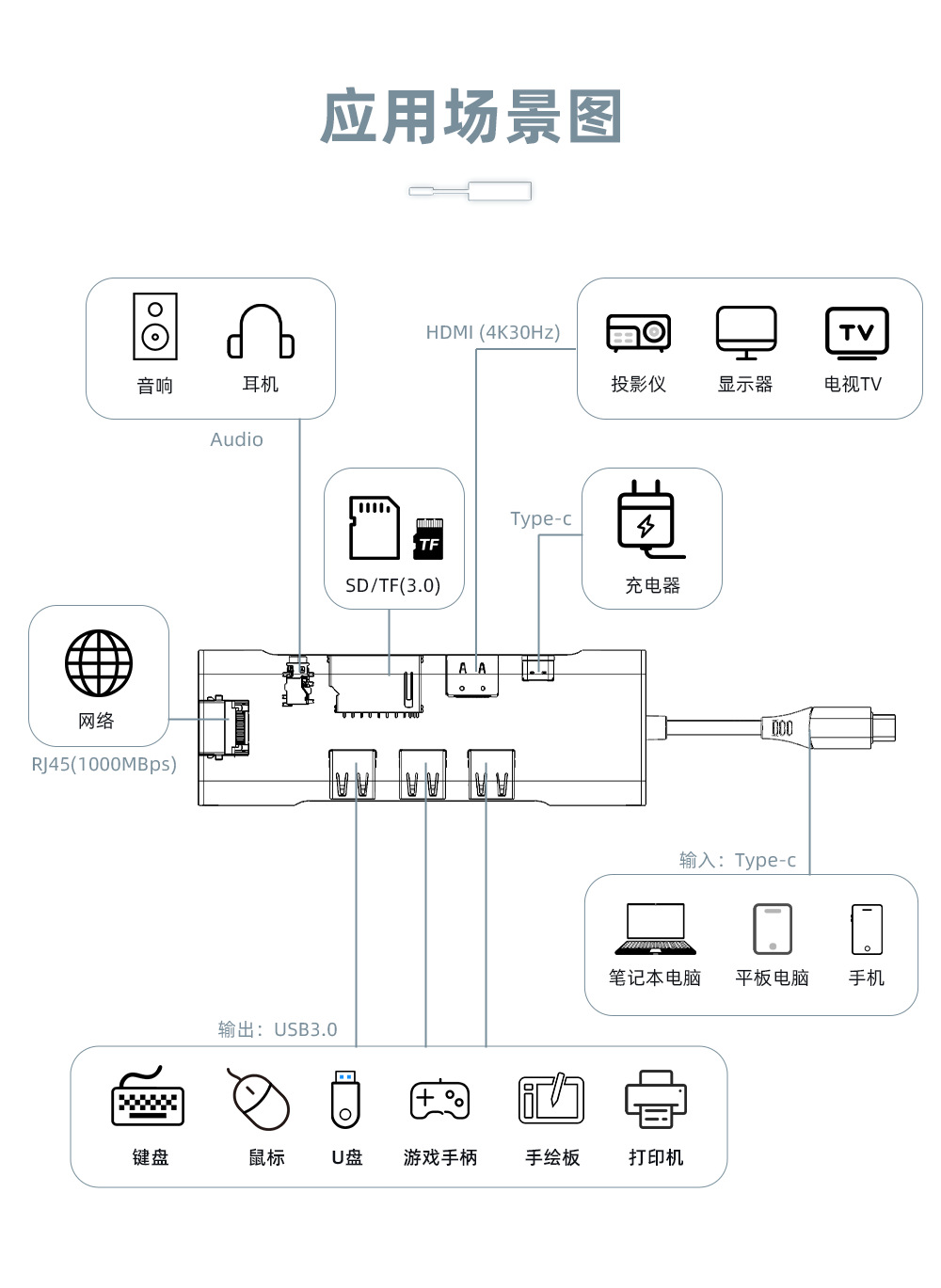 接口配置拉满:输入为Type-C,可扩展出3个USB3.0 接口(传输速率5Gbps)、HDMI接口(支持 4K30Hz 高清输出)、千兆 RJ45 网口、SD/TF 双卡槽(3.0 高速读写)、3.5mm 音频接口,还配备 Type-C PD100W 快充口,兼顾数据、显示、网络、充电多需求。