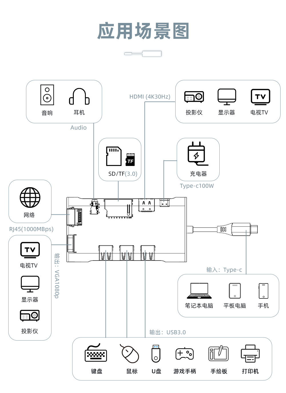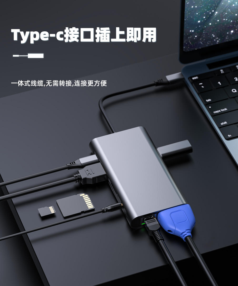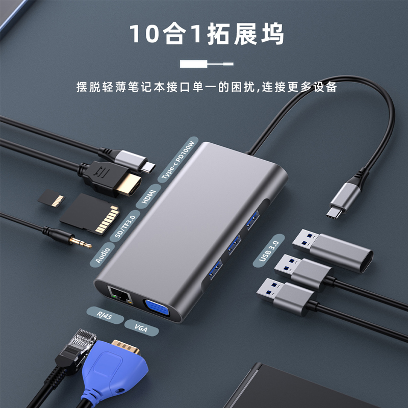 输出接口丰富:包含3个USB3.0接口(传输速率 5Gbps)、HDMI(4K30Hz)+VGA(1080P)双视频接口、千兆 RJ45 网口、SD/TF 双高速卡槽、3.5mm 音频接口,同时配备 Type-C PD100W 快充口,可兼顾数据传输、视频扩展、网络连接、设备充电等多场景需求。