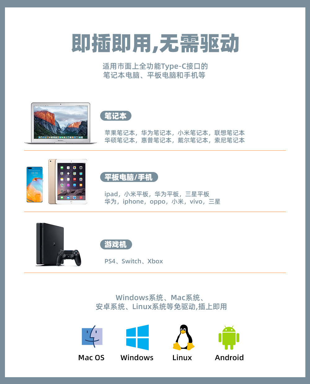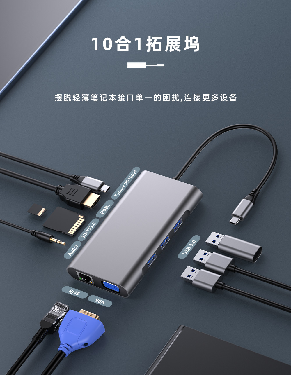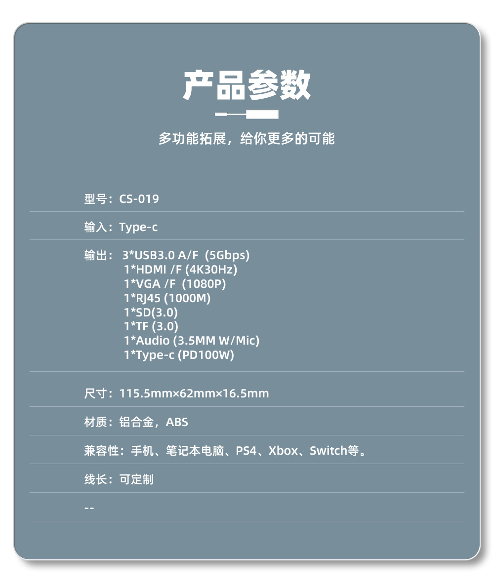输出接口丰富:包含3个USB3.0接口(传输速率 5Gbps)、HDMI(4K30Hz)+VGA(1080P)双视频接口、千兆 RJ45 网口、SD/TF 双高速卡槽、3.5mm 音频接口,同时配备 Type-C PD100W 快充口,可兼顾数据传输、视频扩展、网络连接、设备充电等多场景需求。