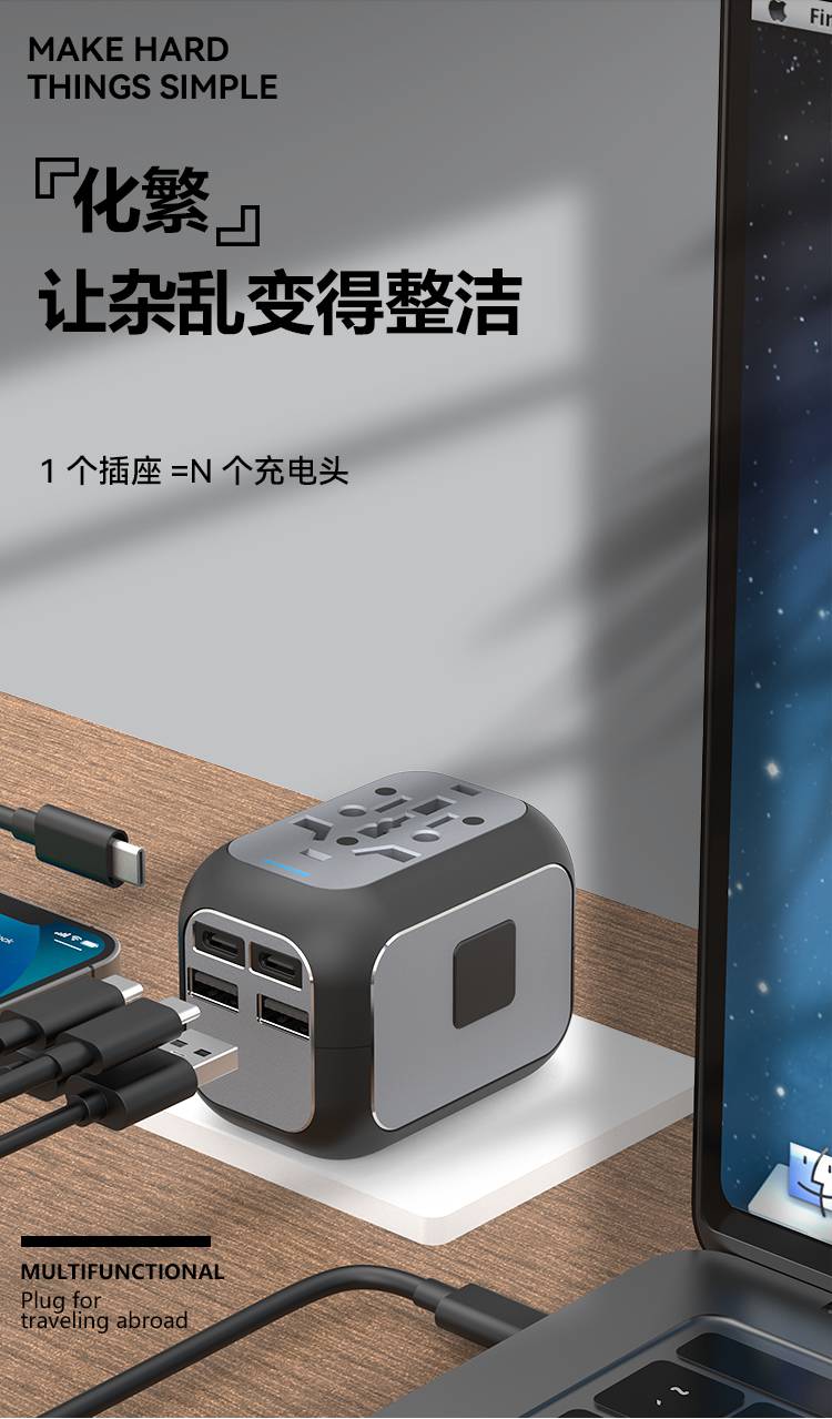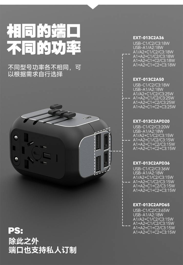 3个C口2个USB-A口多国规格国际旅行充电转换插头,小巧便携,仅掌心大小;相同的端口,不同的功率;解决国际旅行时转换头频繁堆叠及端口不足等问题。