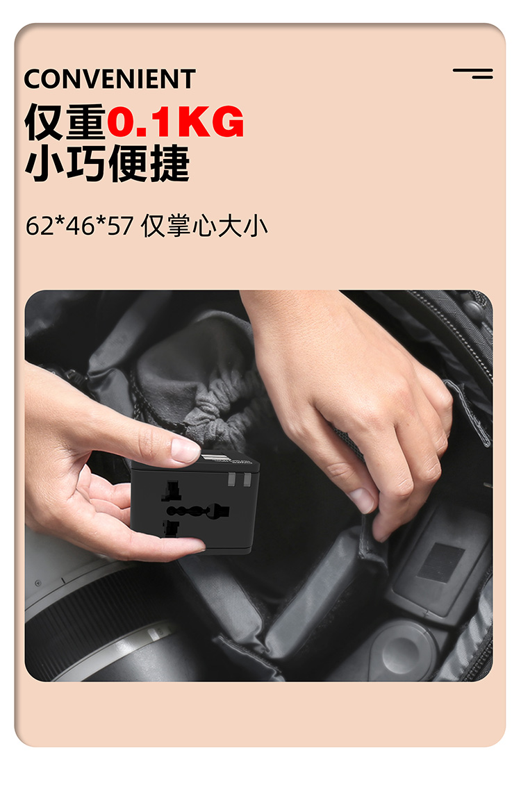 2个A口/2个A口1个C口,1个插座=N个充电头;小巧便携,仅掌心大小;全新升级插座孔,更好的解决国际旅行时端口不足及转换头堆叠等问题。
