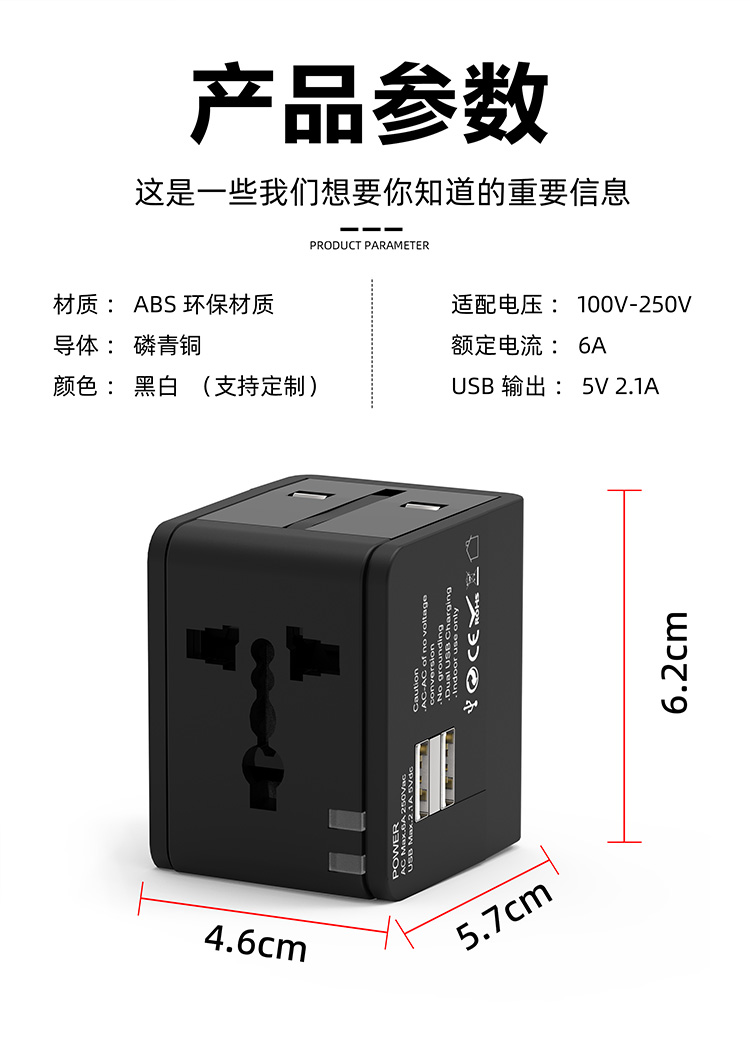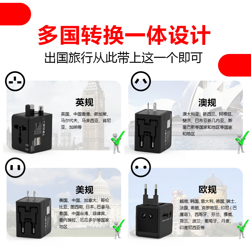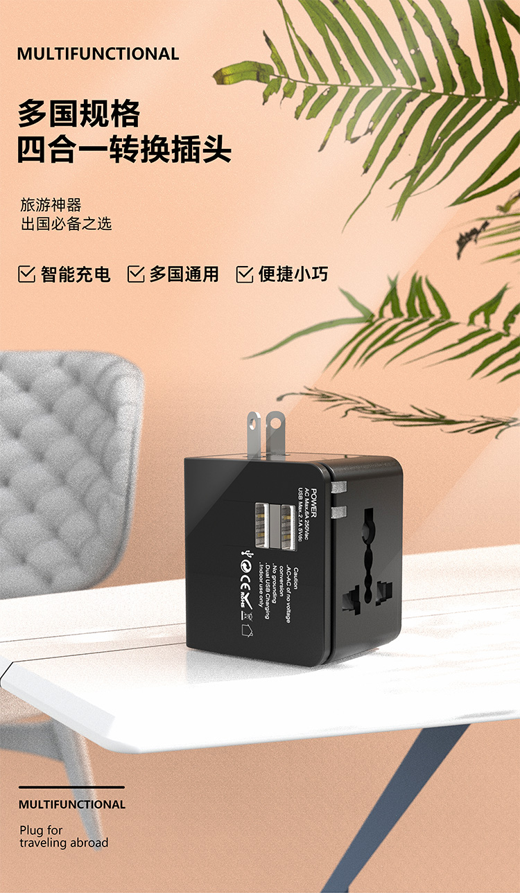 双USB全球通旅行转换插头,2个USB充电,多国转换一体设计,智能充电,四合一转换插头。小巧便携,八重保护,安全出行。