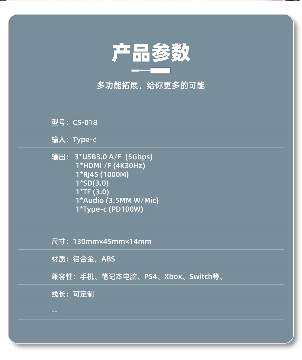 接口配置拉满:输入为Type-C,可扩展出3个USB3.0 接口(传输速率5Gbps)、HDMI接口(支持 4K30Hz 高清输出)、千兆 RJ45 网口、SD/TF 双卡槽(3.0 高速读写)、3.5mm 音频接口,还配备 Type-C PD100W 快充口,兼顾数据、显示、网络、充电多需求。