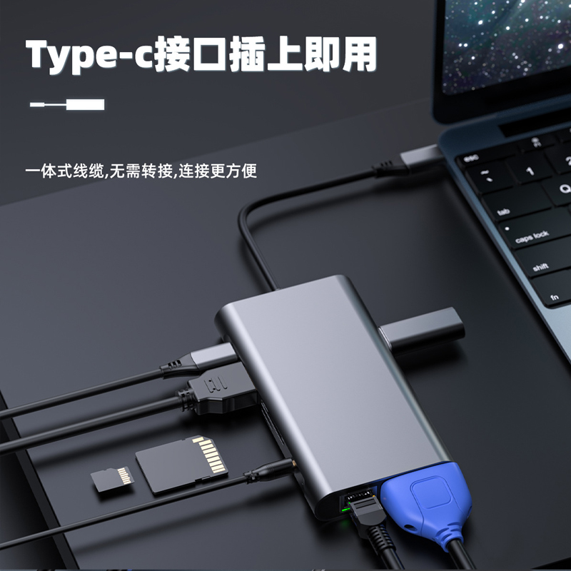 输出接口丰富:包含3个USB3.0接口(传输速率 5Gbps)、HDMI(4K30Hz)+VGA(1080P)双视频接口、千兆 RJ45 网口、SD/TF 双高速卡槽、3.5mm 音频接口,同时配备 Type-C PD100W 快充口,可兼顾数据传输、视频扩展、网络连接、设备充电等多场景需求。