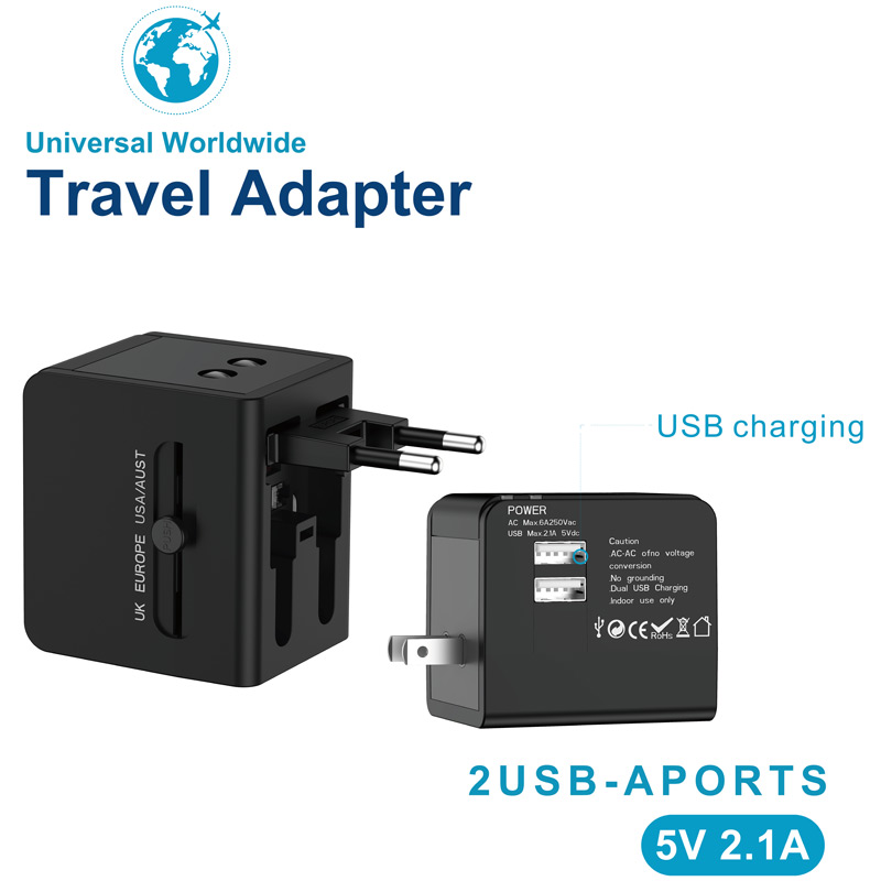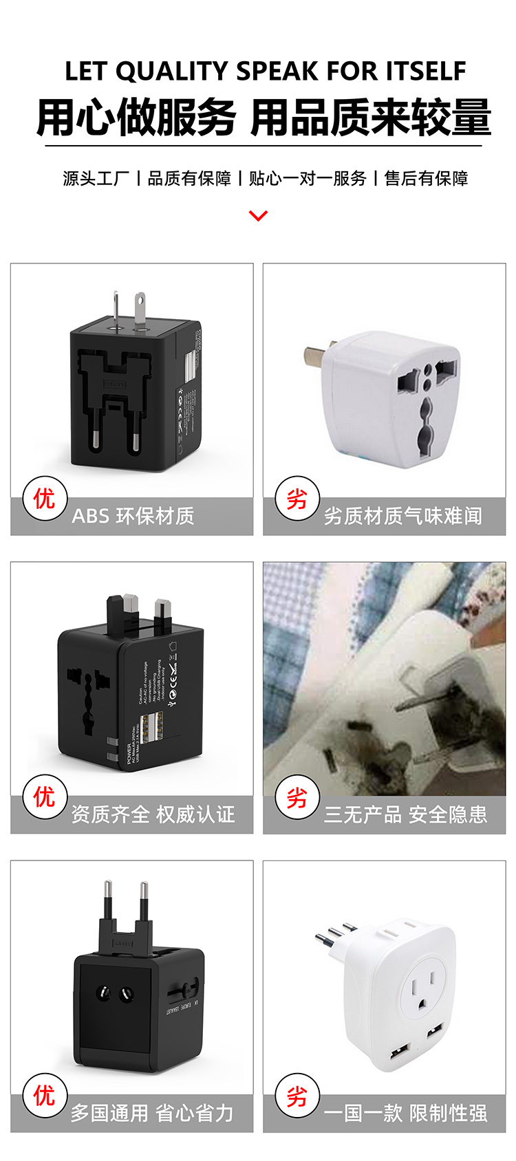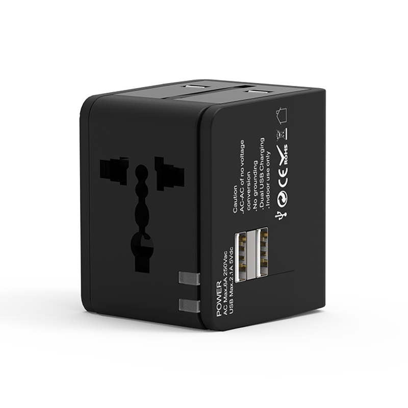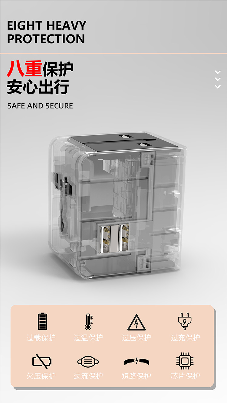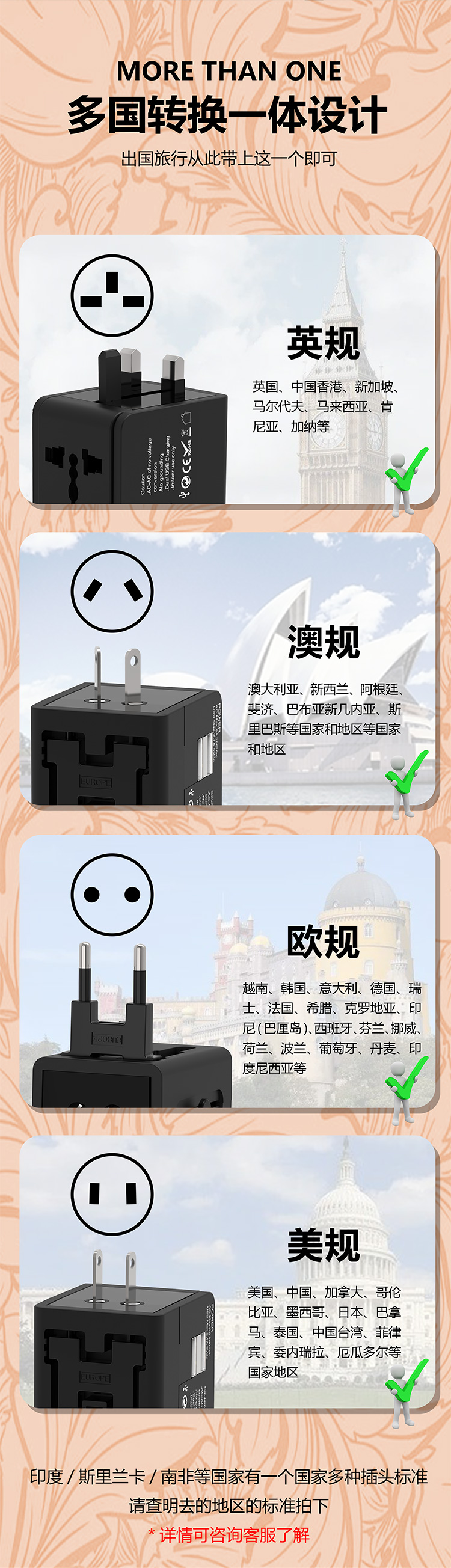 双USB全球通旅行转换插头,2个USB充电,多国转换一体设计,智能充电,四合一转换插头。小巧便携,八重保护,安全出行。