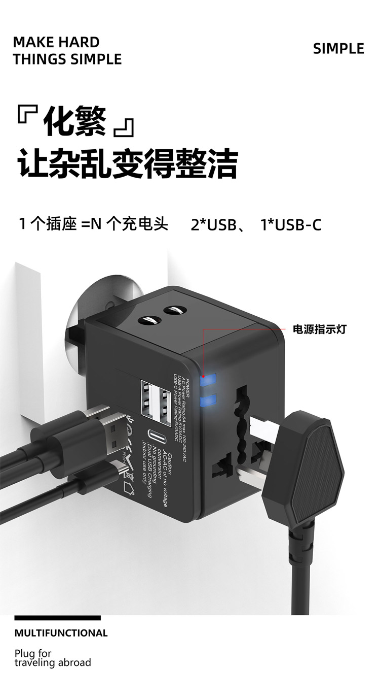 全球通旅行转换插头,2个USB+1个Type-c,多国转换一体设计,智能充电,四合一转换插头。小巧便携,八重保护,安全出行。