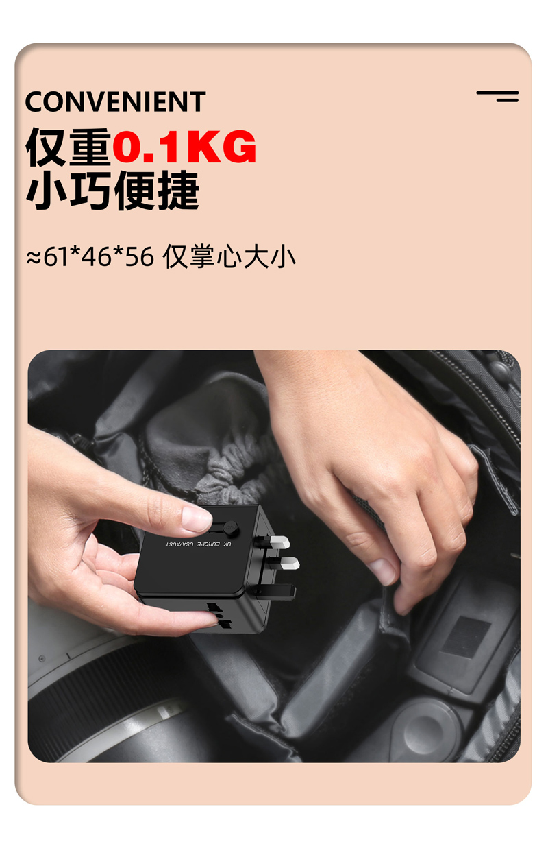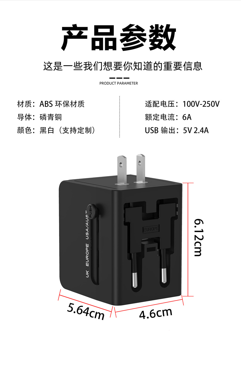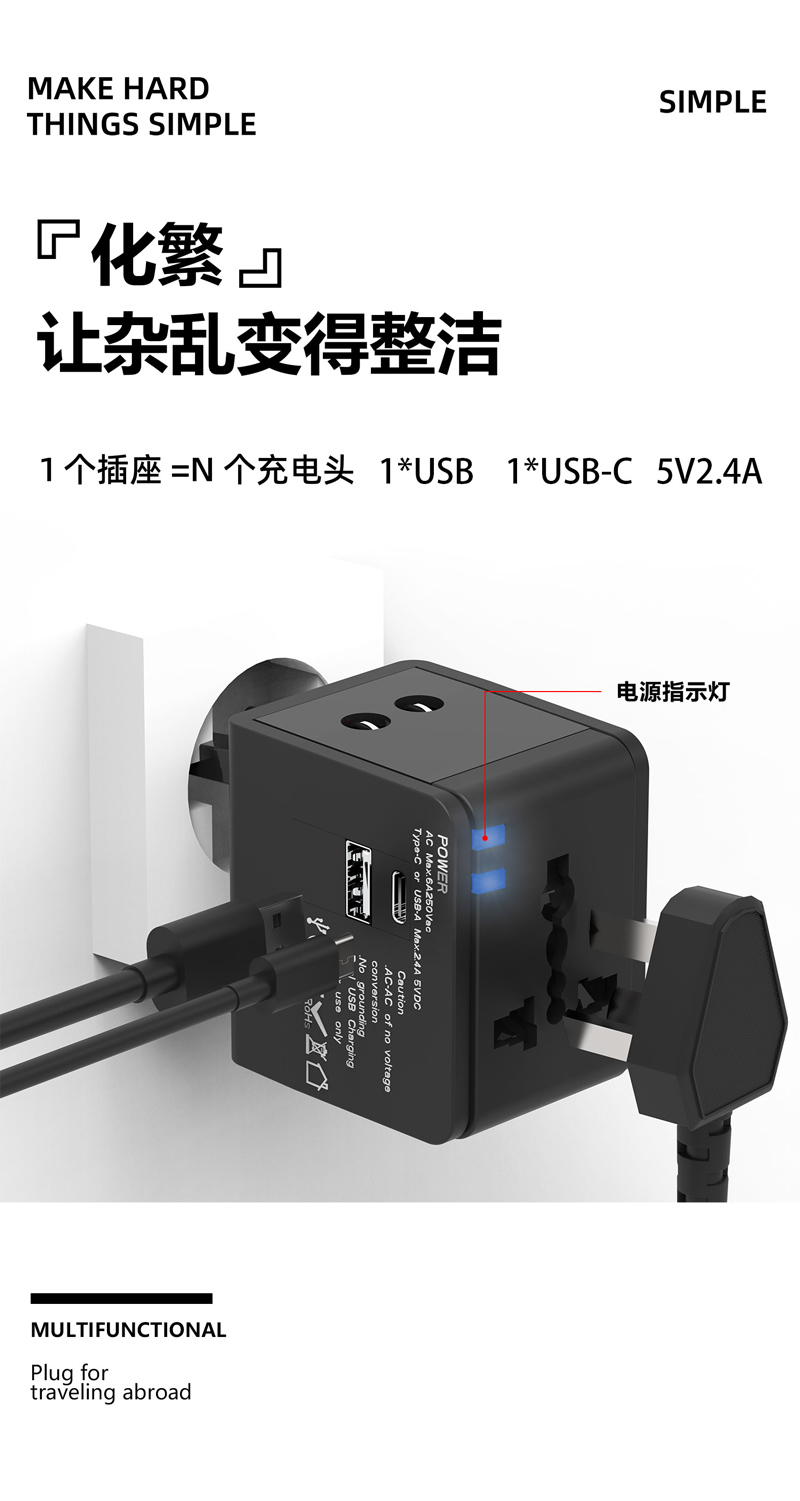 双USB全球通旅行转换插头,1个USB+1个TYPE-C,多国转换一体设计,智能充电,四合一转换插头。小巧便携,八重保护,安全出行。